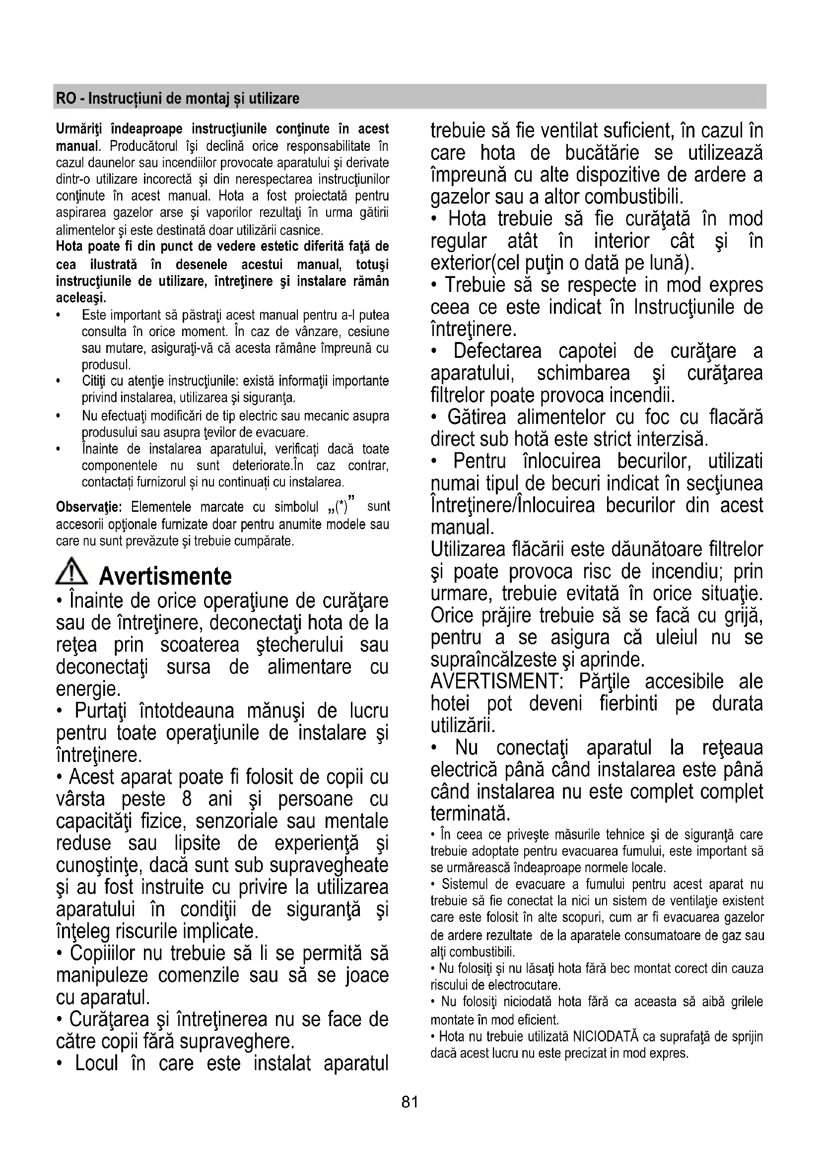 Подмяна на ел. крушки Аспираторът разполага с осветителна система със СВЕТОДИОДИ. СВЕТОДИОДИТЕ гарантират оптимално осветление, до 10 пъти по-силно от традиционните лампи и позволяват 90% икономия на електроенергия. За подмяна се обърнете към сервиза за техническо обслужване.81 RO - Instrucțiuni de montaj și utilizare Urmăriţi îndeaproape instrucţiunile conţinute în acest manual. Producătorul îşi declină orice responsabilitate în cazul daunelor sau incendiilor provocate aparatului şi derivate dintr-o utilizare incorectă şi din nerespectarea instrucţiunilor conţinute în acest manual. Hota a fost proiectată pentru aspirarea gazelor arse şi vaporilor rezultaţi în urma gătirii alimentelor şi este destinată doar utilizării casnice. Hota poate fi din punct de vedere estetic diferită faţă de cea ilustrată în desenele acestui manual, totuşi instrucţiunile de utilizare, întreţinere şi instalare rămân aceleaşi.