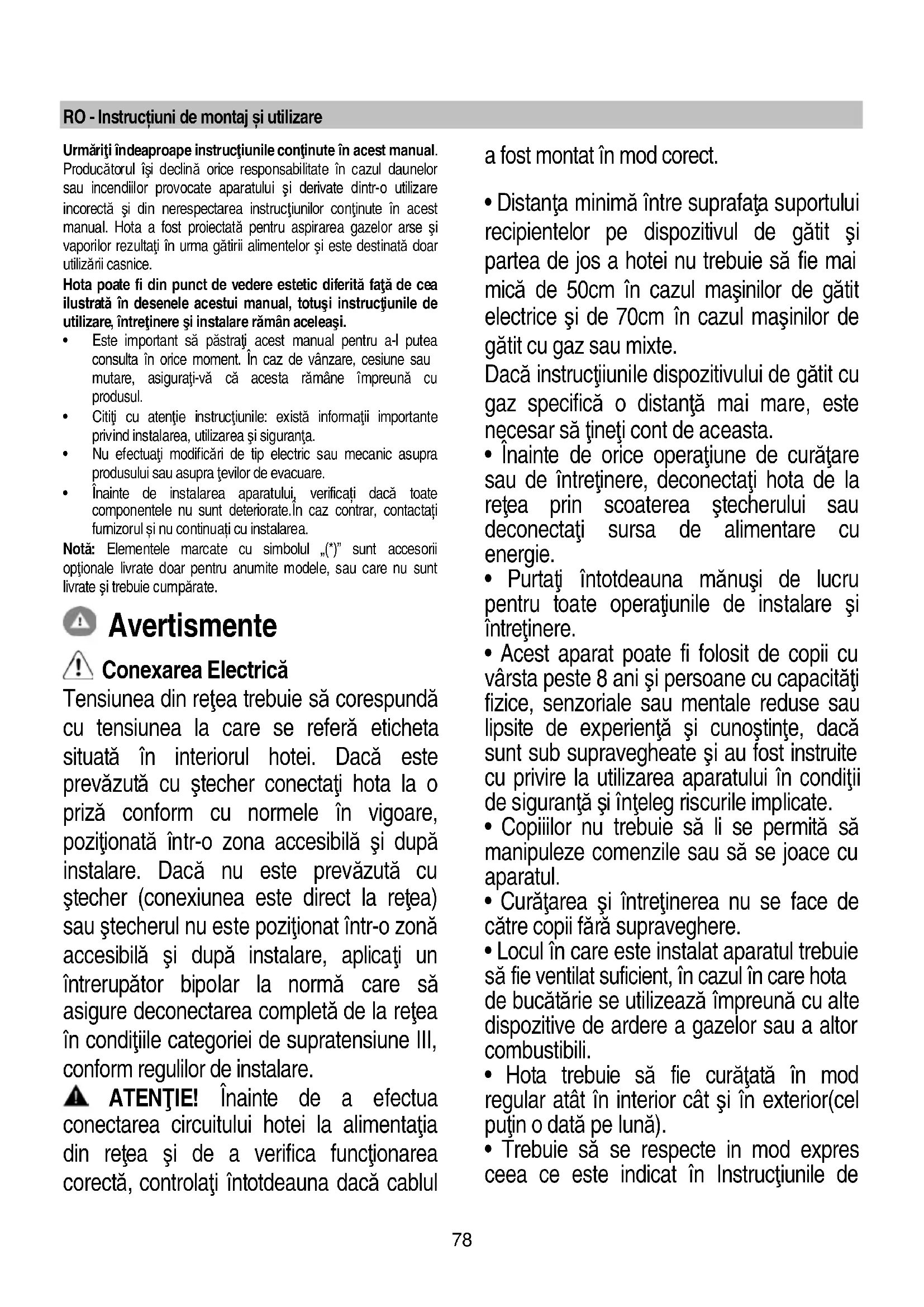 - Înainte de instalarea aparatului, verificați dacă toate componentele nu sunt deteriorate.În caz contrar, contactați furnizorul și nu continuați cu instalarea. Notă: Elementele marcate cu simbolul „(*)” sunt accesorii opţionale livrate doar pentru anumite modele, sau care nu sunt livrate şi trebuie cumpărate. Avertismente Conexarea Electrică Tensiunea din reţea trebuie să corespundă cu tensiunea la care se referă eticheta situată în interiorul hotei. Dacă este prevăzută cu ştecher conectaţi hota la o priză conform cu normele în vigoare, poziţionată într-o zona accesibilă şi după instalare. Dacă nu este prevăzută cu ştecher (conexiunea este direct la reţea) sau ştecherul nu este poziţionat într-o zonă accesibilă şi după instalare, aplicaţi un întrerupător bipolar la normă care să asigure deconectarea completă de la reţea în condiţiile categoriei de supratensiune III, conform regulilor de instalare. ATENŢIE! Înainte de a efectua conectarea circuitului hotei la alimentaţia din reţea şi de a verifica funcţionarea corectă, controlaţi întotdeauna dacă cablul a fost montat în mod corect.