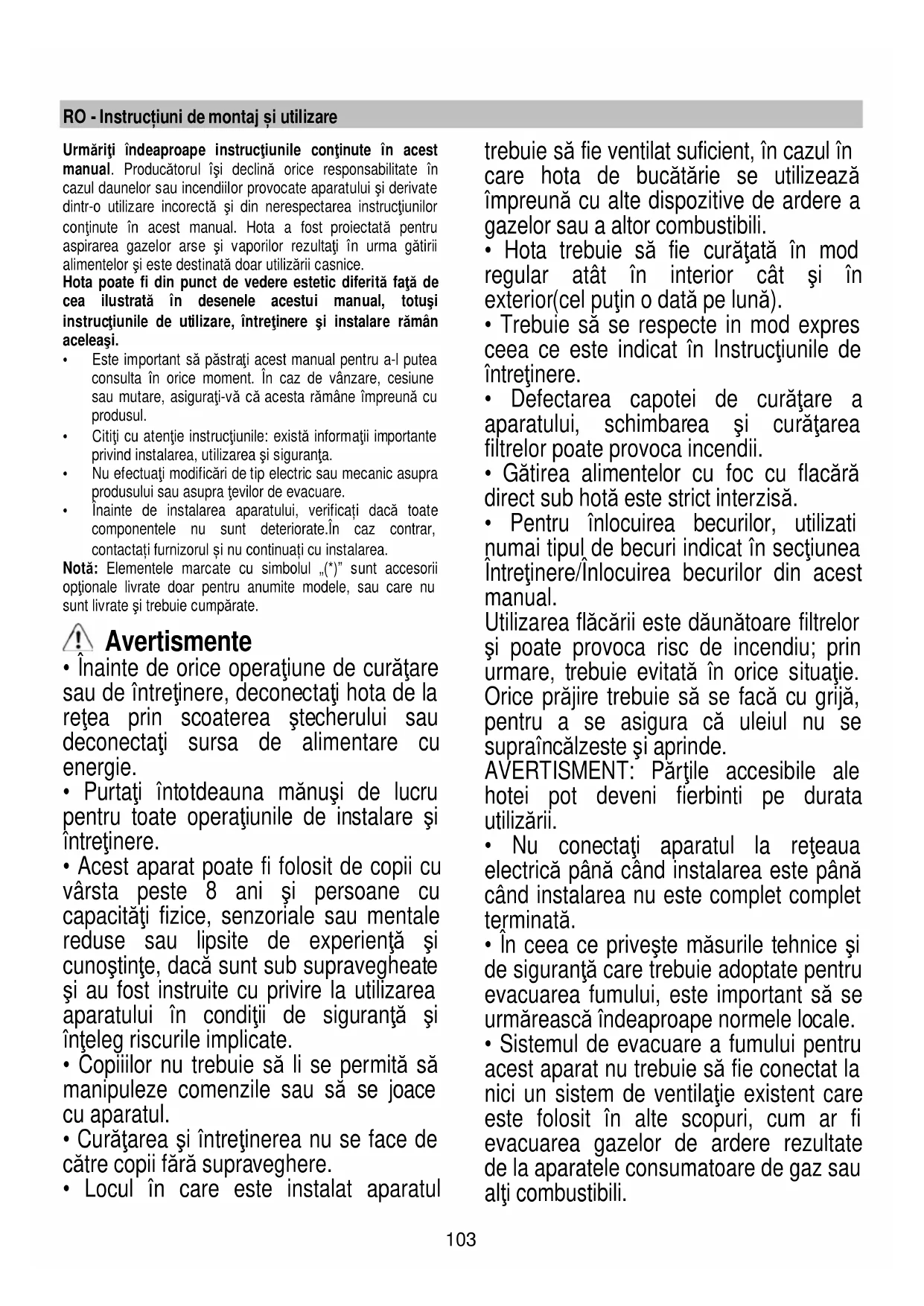 - За да разглобите филтъра с активен въглен изпълнете операциите в обратен ред. Подмяна на ел. крушки Аспираторът разполага с осветителна система със СВЕТОДИОДИ. СВЕТОДИОДИТЕ гарантират оптимално осветление, до 10 пъти по-силно от традиционните лампи и позволяват 90% икономия на електроенергия. Системата за осветление не може да бъде заменена от потребителя, в случай на неизправности, свържете се с отдел техническо обслужване.103 RO - Instrucțiuni de montaj și utilizare Urmăriţi îndeaproape instrucţiunile conţinute în acest manual. Producătorul îşi declină orice responsabilitate în cazul daunelor sau incendiilor provocate aparatului şi derivate dintr-o utilizare incorectă şi din nerespectarea instrucţiunilor conţinute în acest manual. Hota a fost proiectată pentru aspirarea gazelor arse şi vaporilor rezultaţi în urma gătirii alimentelor şi este destinată doar utilizării casnice. Hota poate fi din punct de vedere estetic diferită faţă de cea ilustrată în desenele acestui manual, totuşi instrucţiunile de utilizare, întreţinere şi instalare rămân aceleaşi.
