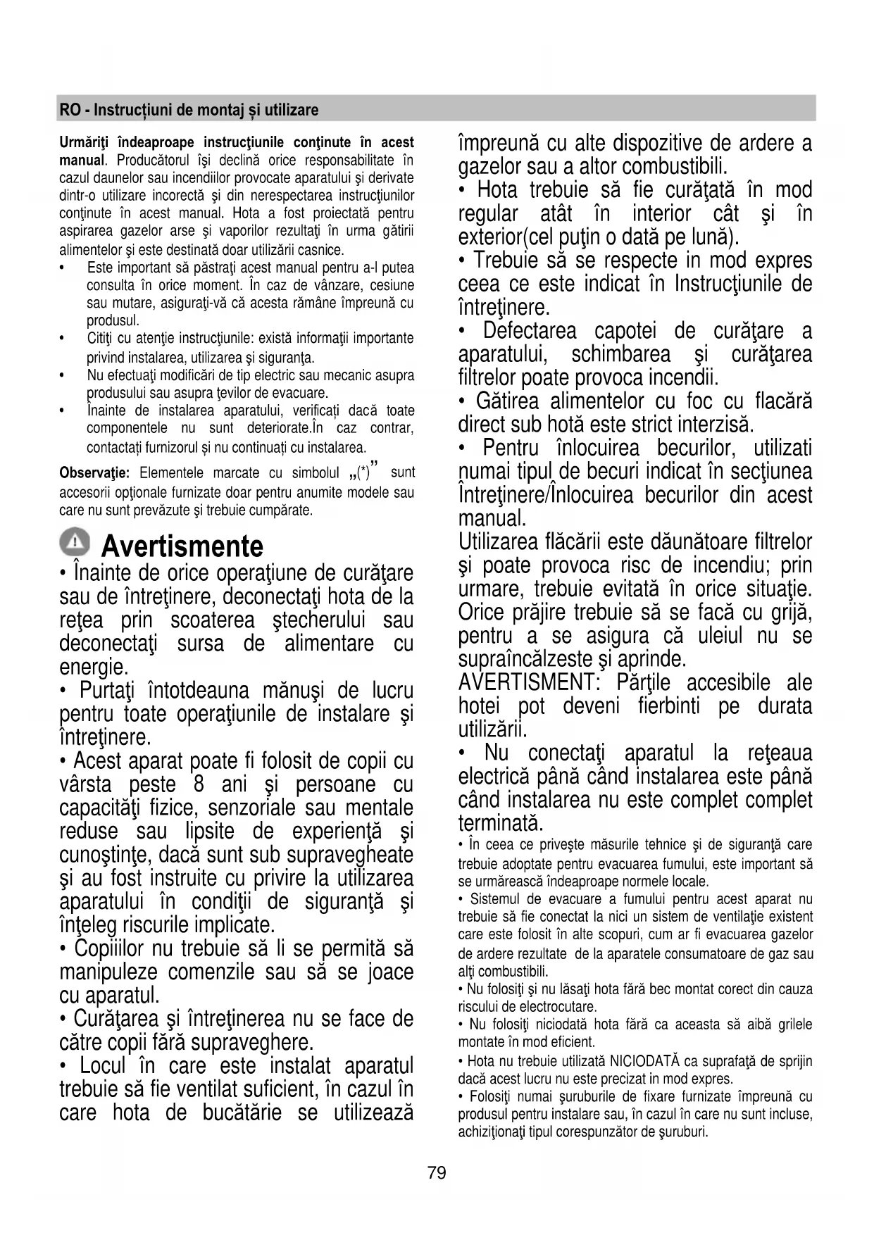- EMC: EN 55014-1; CISPR 14-1; EN 55014-2; CISPR 14-2; EN/IEC 61000-3-2; EN/IEC 61000-3-3. Recomandări pentru o utilizare corespunzătoare în scopul reducerii impactului asupra mediului: Când începeţi să gătiţi, porniţi hota la viteză minimă şi lăsaţi-o să funcţioneze timp câteva minute după ce aţi terminat de gătit. Mă riţi viteza în cazul cantităţilor mari de fum sau vapori şi utilizaţi viteza/ele sporită/e doar în cazuri extreme. Înlocuiţi filtrul/ele de carbon, atunci când este necesar, pentru a menţine o eficienţă optimă de reducere a mirosului. Curăţaţi filtrul/ele de grăsime, atunci când este necesar, pentru a menţine o eficienţă optimă a filtrului. Utilizaţi diametrul maxim al sistemului de conducte indicat în acest manual pentru a optimiza eficienţa şi pentru a reduce la minimum nivelul de zgomot. Utilizarea Hota a fost realizată pentru a fi utilizată în versiunea aspirantă cu evacuare externă sau în versiunea filtrantă cu recirculare internă. Versiunea aspirare Vaporii sunt evacuaţi către exterior prin intermediul unui tub de evacuare fixat la flanşa de racord. ATENŢIE! Tubul de evacuare nu se furnizează din dotare; acesta trebuie achiziţionat. Diametrul tubului de evacuare trebuie să fie echivalent cu diametrul inelului de conexiune. ATENŢIE! Dacă hota este prevăzută cu filtre de carbon, acestea trebuie să fie scoase. Racordaţi hota la cablurile şi orificiile de evacuare prin perete cu diametru egal cu ieşirea aerului (flanşa de record). Utilizarea tuburilor şi orificiilor de evacuare la perete cu diametrul mai mic va determina o diminuare a prestaţiilor de aspirare şi o creştere drastică a zgomotului. Se declină însă orice responsabilitate în acest sens. ! Folosiţi un tub de lungime minimă indispensabilă. ! Folosiţi un tub cu un număr cât mai mic de curbe posibil (unghiul maxim al curbei: 90°). ! Evitaţi schimbările drastice de secţiune ale tubului. Versiunea cu filtrare Aerul aspirat va fi degresat şi dezodorizat înainte de a fi reintrodus în cameră. Pentru a utiliza hota în această versiune este necesar să instalaţi un sistem de filtrare suplimentar pe bază de carbon activ. Instalarea Distanţa minimă între suprafaţa suportului recipientelor pe dispozitivul de gătit şi partea de jos a hotei nu trebuie să fie mai mică de 50cm în cazul maşinilor de gătit electrice şi de 50cm în cazul maşinilor de găt it cu gaz sau mixte. Dacă instrucţiiunile dispozitivului de gătit cu gaz specifică o distanţă mai mare, este necesar să ţineţi cont de aceasta. Conexarea Electrică Tensiunea din reţea trebuie să corespundă cu tensiunea la care se referă eticheta situată în interiorul hotei. Dacă este prevăzută cu ştecher conectaţi hota la o priză conform cu normele în vigoare, poziţionată într-o zona accesibilă şi după instalare. Dacă nu este prevăzută cu ştecher (conexiunea este direct la reţea) sau ştecherul nu este poziţionat într-o zonă accesibilă şi după instalare, aplicaţi un întrerupător bipolar la normă care să asigure deconectarea completă de la reţea în condiţiile categoriei de supratensiune III, conform81 regulilor de instalare. ATENŢIE! Înainte de a efectua conectarea circuitului hotei la alimentaţia din reţea şi de a verifica funcţionarea corectă, controlaţi întotdeauna dacă cablul a fost montat în mod corect. Atenţie! înlocuirea cablului de alimentare trebuie să fie efectuată numai de către serviciul de asistenţă tehnică autorizat în aşa fel încât să poată preveni orice risc. Montarea Acest tip de hotă trebuie să fie montat sub un dulap de bucătărie sau sub un alt suport. Informaţii preliminare pentru instalare: