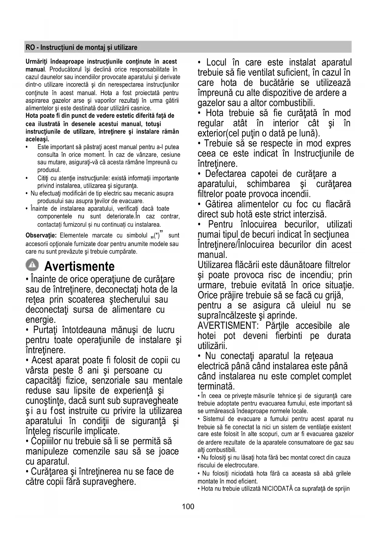 При демонтажа завъртете в посока обратна на часовниковата стрелка. Подмяна на ел. крушки Фиг. 22 Аспираторът разполага с осветителна система със СВЕТОДИОДИ. СВЕТОДИОДИТЕ гарантират оптимално осветление, до 10 пъти по-силно от традиционните лампи и позволяват 90% икономия на електроенергия.99 За да подмените лампите, моля свържете с оторизирания сервиз за резервни части.100 RO - Instrucțiuni de montaj și utilizare Urmăriţi îndeaproape instrucţiunile conţinute în acest manual. Producătorul îşi declină orice responsabilitate în cazul daunelor sau incendiilor provocate aparatului şi derivate dintr-o utilizare incorectă şi din nerespectarea instrucţiunilor conţinute în acest manual. Hota a fost proiectată pentru aspirarea gazelor arse şi vaporilor rezultaţi în urma gătirii alimentelor şi este destinată doar utilizării casnice. Hota poate fi din punct de vedere estetic diferită faţă de cea ilustrată în desenele acestui manual, totuşi instrucţiunile de utilizare, întreţinere şi instalare rămân aceleaşi.