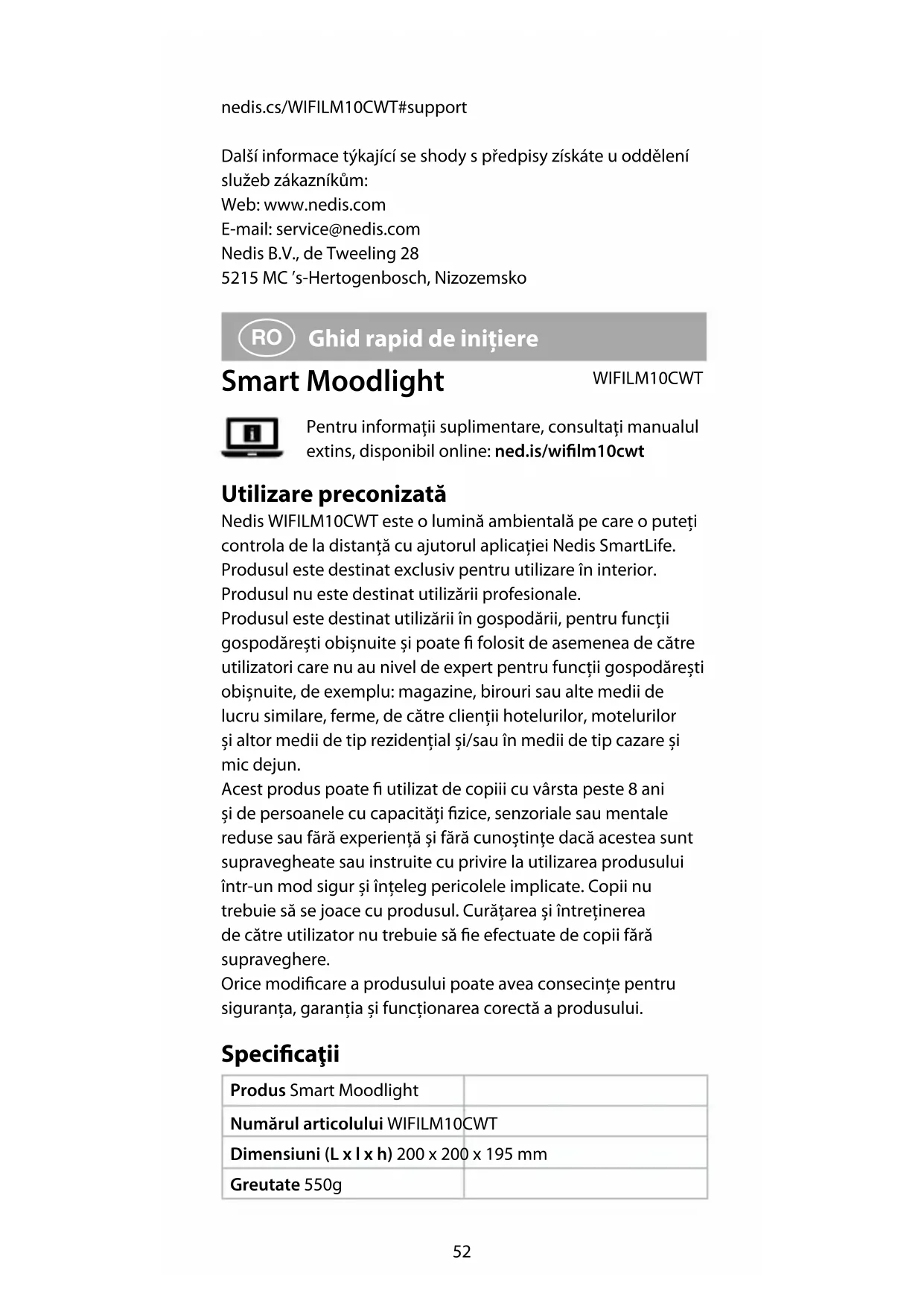 Ghid rapid de inițiere Smart Moodlight WIFILM10CWT Pentru informații suplimentare, consultați manualul extins, disponibil online: ned.is/wilm10cwt Utilizare preconizată Nedis WIFILM10CWT este o lumină ambientală pe care o puteți controla de la distanță cu ajutorul aplicației Nedis SmartLife. Produsul este destinat exclusiv pentru utilizare în interior. Produsul nu este destinat utilizării profesionale. Produsul este destinat utilizării în gospodării, pentru funcții gospodărești obișnuite și poate folosit de asemenea de către utilizatori care nu au nivel de expert pentru funcții gospodărești obișnuite, de exemplu: magazine, birouri sau alte medii de lucru similare, ferme, de către clienții hotelurilor, motelurilor și altor medii de tip rezidențial și/sau în medii de tip cazare și mic dejun. Acest produs poate utilizat de copiii cu vârsta peste 8 ani și de persoanele cu capacități zice, senzoriale sau mentale reduse sau fără experiență și fără cunoștințe dacă acestea sunt supravegheate sau instruite cu privire la utilizarea produsului într-un mod sigur și înțeleg pericolele implicate. Copii nu trebuie să se joace cu produsul. Curățarea și întreținerea de către utilizator nu trebuie să e efectuate de copii fără supraveghere. Orice modicare a produsului poate avea consecințe pentru siguranța, garanția și funcționarea corectă a produsului. Specicaţii Produs Smart Moodlight Numărul articolului WIFILM10CWT Dimensiuni (L x l x h) 200 x 200 x 195 mm Greutate 550g53 Intrare alimentare electrică 220 - 240 VAC ; 50 Hz Temperatură de funcționare 0 °C - 40 °C Gama de temperatură a culorilor 2700 K - 6500 K Frecvență Wi-Fi 2400 - 2484 MHz Putere maximă de transmisie radio 16 dBm Piese principale (imagine A) 1 Lampă 2 Port micro USB 3 Adaptor electric 4 Cablu de alimentare USB 5 Comutator pornit/oprit Instrucțiuni de siguranță