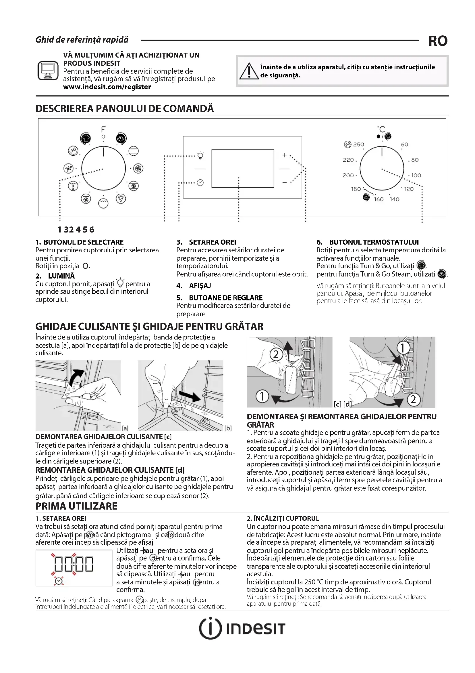 [c] [d]DEMONTAREA ŞI REMONTAREA GHIDAJELOR PENTRU GRĂTAR1. Pentru a scoate ghidajele pentru grătar, apucaţi ferm de partea exterioară a ghidajului şi trageţi-l spre dumneavoastră pentru a scoate suportul şi cei doi pini interiori din locaş.2. Pentru a repoziţiona ghidajele pentru grătar, poziţionaţi-le în apropierea cavităţii şi introduceţi mai întâi cei doi pini în locaşurile aferente. Apoi, poziţionaţi partea exterioară lângă locaşul său, introduceţi suportul şi apăsaţi ferm spre peretele cavităţii pentru a vă asigura că ghidajul pentru grătar este xat corespunzător.PRIMA UTILIZARE1. SETAREA OREIVa trebui să setaţi ora atunci când porniţi aparatul pentru prima dată: Apăsaţi pe până când pictograma şi cele două cifre aferente orei încep să clipească pe aşaj.Utilizaţi sau pentru a seta ora şi apăsaţi pe pentru a conrma. Cele două cifre aferente minutelor vor începe să clipească. Utilizaţi sau pentru a seta minutele şi apăsaţi pentru a conrma.Vă rugăm să reţineţi: Când pictograma clipeşte, de exemplu, după întreruperi îndelungate ale alimentării electrice, va necesar să resetaţi ora.2. ÎNCĂLZIŢI CUPTORULUn cuptor nou poate emana mirosuri rămase din timpul procesului de fabricaţie: Acest lucru este absolut normal. Prin urmare, înainte de a începe să preparaţi alimentele, vă recomandăm să încălziţi cuptorul gol pentru a îndepărta posibilele mirosuri neplăcute.Îndepărtaţi elementele de protecţie din carton sau foliile transparente ale cuptorului şi scoateţi accesoriile din interiorul acestuia.Încălziţi cuptorul la 250 °C timp de aproximativ o oră. Cuptorul trebuie să e gol în acest interval de timp.Vă rugăm să reţineţi: Se recomandă să aerisiţi încăperea după utilizarea aparatului pentru prima dată.DESCRIEREA PANOULUI DE COMANDĂ1 32 4 5 61. BUTONUL DE SELECTAREPentru pornirea cuptorului prin selectareaunei funcţii.Rotiţi în poziţia .2. LUMINĂCu cuptorul pornit, apăsaţi pentru aaprinde sau stinge becul din interiorul cuptorului.3. SETAREA OREIPentru accesarea setărilor duratei de preparare, pornirii temporizate şi a temporizatorului.Pentru aşarea orei când cuptorul este oprit.4. AFIŞAJ5. BUTOANE DE REGLAREPentru modicarea setărilor duratei de preparare6. BUTONUL TERMOSTATULUIRotiţi pentru a selecta temperatura dorită la activarea funcţiilor manuale. Pentru funcţia Turn & Go, utilizaţi pentru funcţia Turn & Go Steam, utilizaţi .Vă rugăm să reţineţi: Butoanele sunt la nivelul panoului. Apăsaţi pe mijlocul butoanelor pentru a le face să iasă din locaşul lor.VĂ MULŢUMIM CĂ AŢI ACHIZIŢIONAT UN PRODUS INDESITPentru a benecia de servicii complete de asistenţă, vă rugăm să vă înregistraţi produsul pe www . indesit . com / register Înainte de a utiliza aparatul, citiţi cu atenţie instrucţiunile de siguranţă.FUNCŢII ŞI UTILIZAREA ZILNICĂ