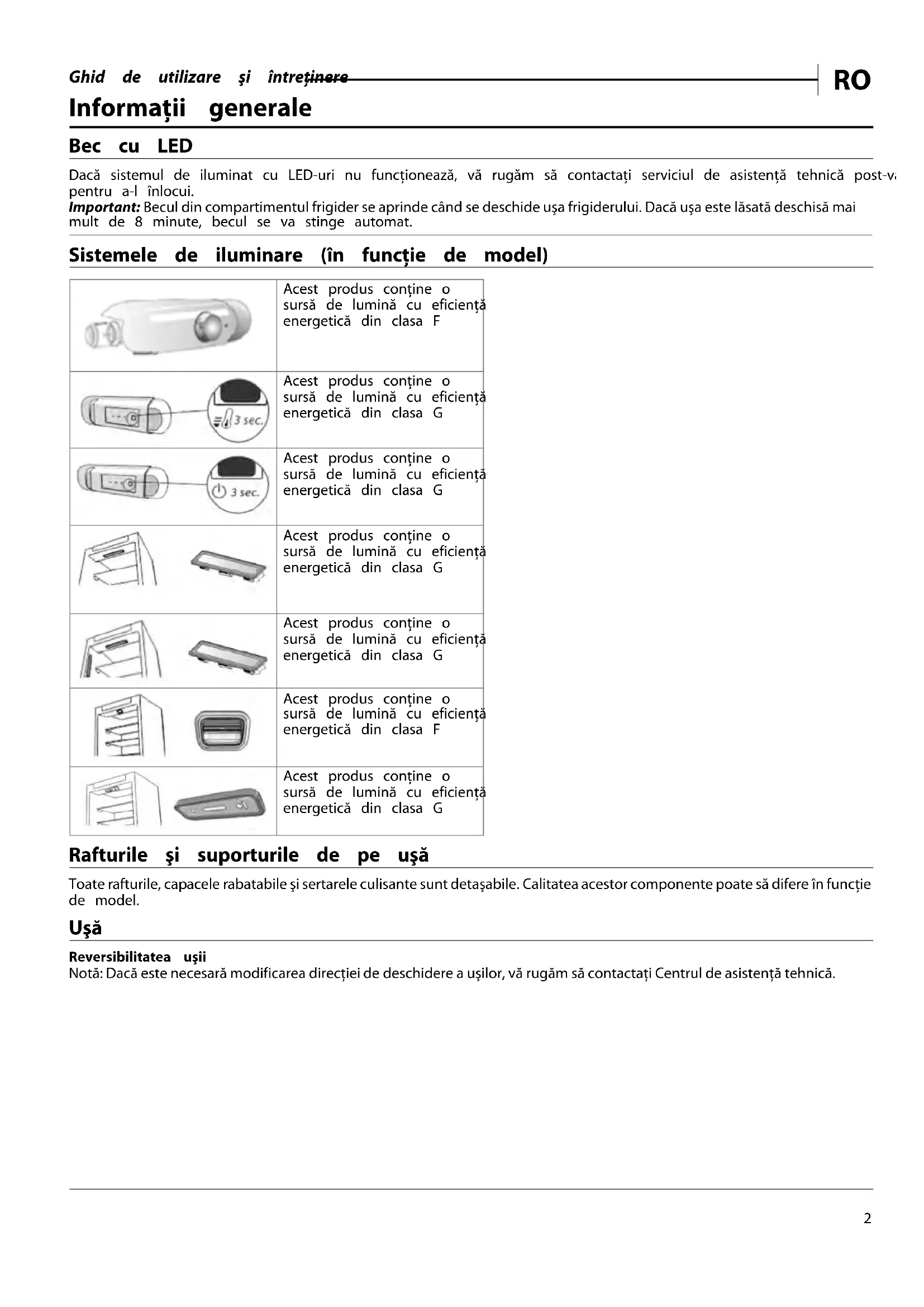 Informaţii generale Bec cu LED Dacă sistemul de iluminat cu LED-uri nu funcţionează, vă rugăm să contactaţi serviciul de asistenţă tehnică post-vânzare pentru a-l înlocui. Important: Becul din compartimentul frigider se aprinde când se deschide uşa frigiderului. Dacă uşa este lăsată deschisă mai mult de 8 minute, becul se va stinge automat. Sistemele de iluminare (în funcţie de model) Acest produs conţine o sursă de lumină cu eficienţă energetică din clasa F Acest produs conţine o sursă de lumină cu eficienţă energetică din clasa G Acest produs conţine o sursă de lumină cu eficienţă energetică din clasa G Acest produs conţine o sursă de lumină cu eficienţă energetică din clasa G Acest produs conţine o sursă de lumină cu eficienţă energetică din clasa G Acest produs conţine o sursă de lumină cu eficienţă energetică din clasa F Acest produs conţine o sursă de lumină cu eficienţă energetică din clasa G Rafturile şi suporturile de pe uşă Toate rafturile, capacele rabatabile şi sertarele culisante sunt detaşabile. Calitatea acestor componente poate să difere în funcţie de model. Uşă Reversibilitatea uşii Notă: Dacă este necesară modificarea direcţiei de deschidere a uşilor, vă rugăm să contactaţi Centrul de asistenţă tehnică.Ghid de utilizare şi întreţinere