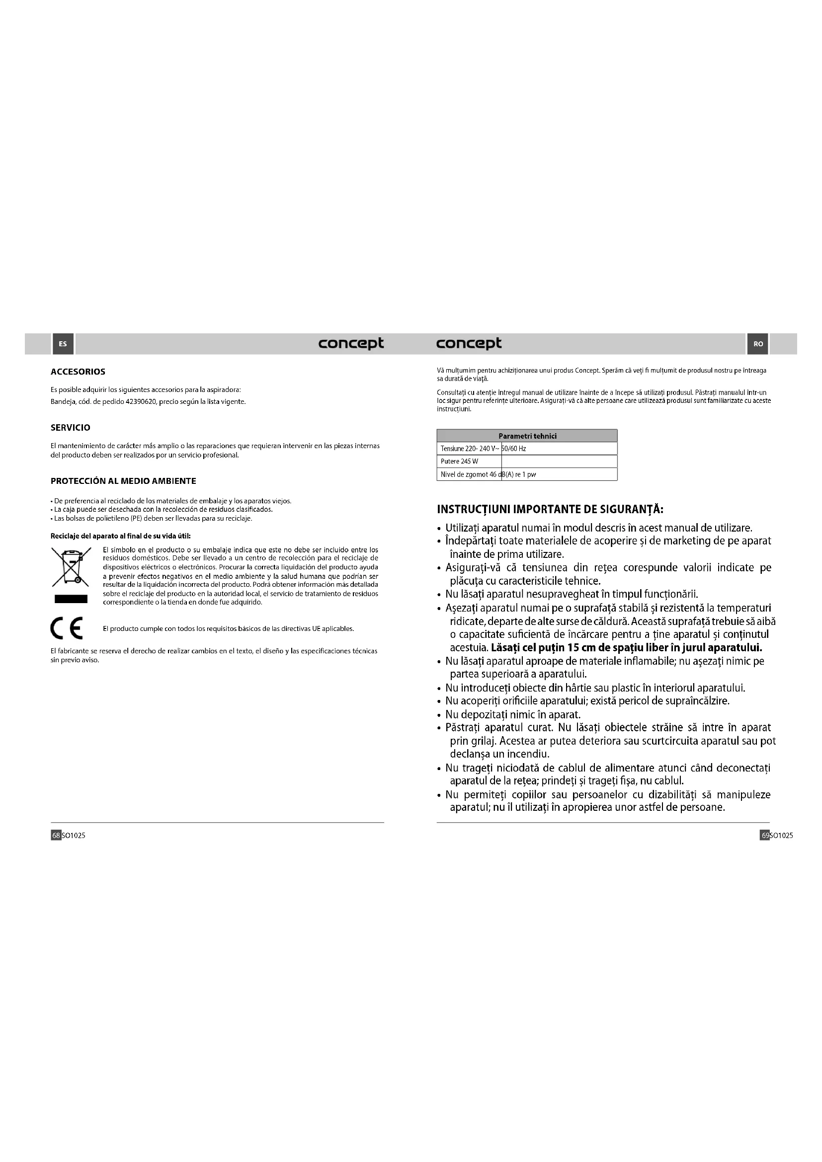 SO 1025 Vă mulțumim pentru achiziționarea unui produs Concept. Sperăm că veți fi mulțumit de produsul nostru pe întreaga sa durată de viaţă. Consultați cu atenție întregul manual de utilizare înainte de a începe să utilizați produsul. Păstrați manualul într-un loc sigur pentru referințe ulterioare. Asigurați-vă că alte persoane care utilizează produsul sunt familiarizate cu aceste instrucțiuni. Parametri tehnici Tensiune 220- 240 V~ 50/60 Hz Putere 245 W Nivel de zgomot 46 dB(A) re 1 pw INSTRUCȚIUNI IMPORTANTE DE SIGURANȚĂ: