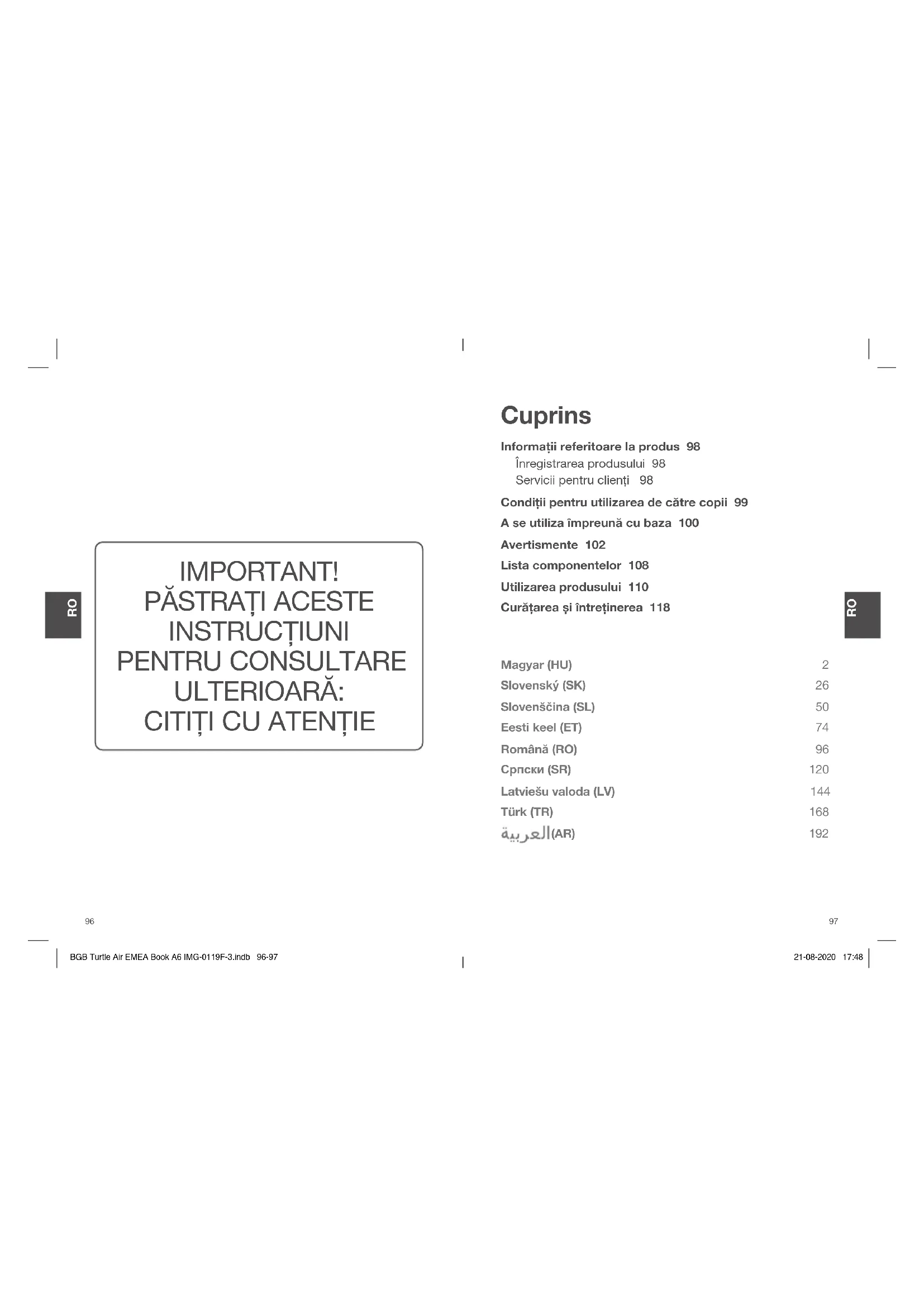 BGB Turtle Air EMEA Book A6 IMG-0119F-3.indb 94-95BGB Turtle Air EMEA Book A6 IMG-0119F-3.indb 94-95 21-08-2020 17:4821-08-2020 17:48Cuprins Informații referitoare la produs 98 Înregistrarea produsului 98 Servicii pentru clienți 98 Condiții pentru utilizarea de către copii 99 A se utiliza împreună cu baza 100 Avertismente 102 Lista componentelor 108 Utilizarea produsului 110 Curățarea și întreținerea 118 IMPORTANT!