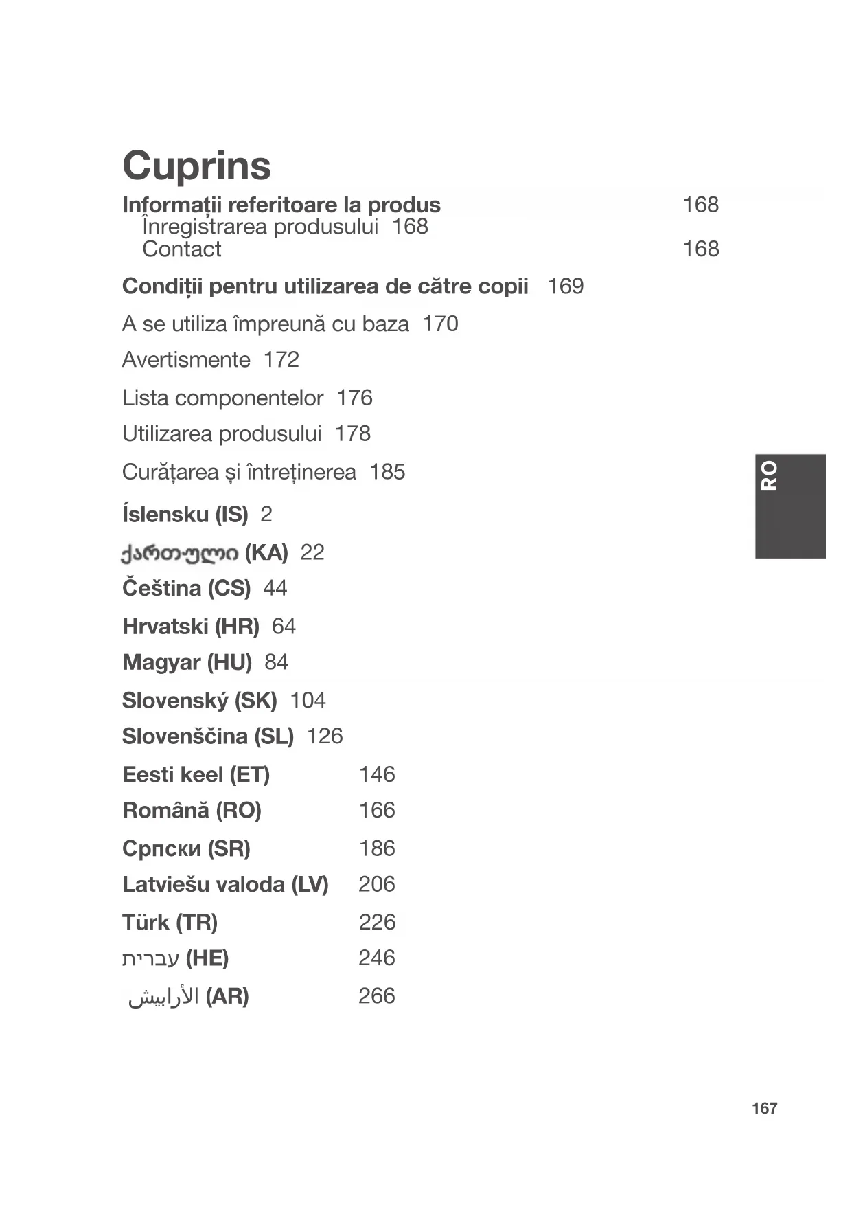 ROCuprins Informații referitoare la produs 168 Înregistrarea produsului 168 Contact 168 Condiții pentru utilizarea de către copii 169 A se utiliza împreună cu baza 170 Avertismente 172 Lista componentelor 176 Utilizarea produsului 178 Curățarea și întreținerea 185 Íslensku (IS) 2 (KA) 22 Čeština (CS) 44 Hrvatski (HR) 64 Magyar (HU) 84 Slovenský (SK) 104 Slovenščina (SL) 126 Eesti keel (ET) 146 Română (RO) 166 Српски (SR) 186 Latviešu valoda (LV) 206 Türk (TR) 226 תירבע (HE) 246 شيبارا (AR) 266