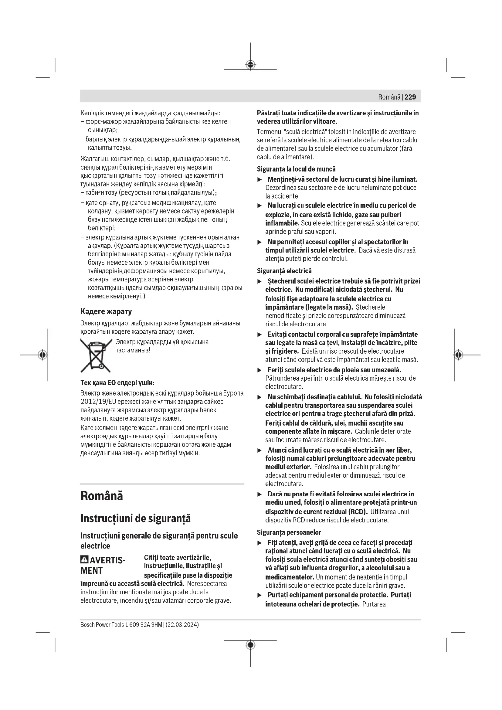 – электр құралына артық жүктеме түскеннен орын алған ақаулар. (Құралға артық жүктеме түсудің шартсыз белгілеріне мыналар жатады: құбылу түсінің пайда болуы немесе электр құралы бөліктері мен түйіндерінің деформациясы немесе қорытылуы, жоғары температура әсерінен электр қозғалтқышындағы сымдар оқшаулағышының қараюы немесе көмірленуі.) Кәдеге жарату Электр құралдар, жабдықтар және бумаларын айналаны қорғайтын кәдеге жаратуға апару қажет. Электр құралдарды үй қоқысына тастамаңыз! Тек қана ЕО елдері үшін: Электр және электрондық ескі құралдар бойынша Еуропа 2012/19/EU ережесі және ұлттық заңдарға сайкес пайдалануға жарамсыз электр құралдары бөлек жиналып, кәдеге жаратылуы қажет. Қате жолмен кәдеге жаратылған ескі электрлік және электрондық құрылғылар қауіпті заттардың болу мүмкіндігіне байланысты қоршаған ортаға және адам денсаулығына зиянды әсер тигізуі мүмкін. Română Instrucţiuni de siguranţă Instrucţiuni generale de siguranţă pentru scule electrice AVERTIS- MENT Citiţi toate avertizările, instrucţiunile, ilustraţiile şi specificaţiile puse la dispoziţie împreună cu această sculă electrică. Nerespectarea instrucţiunilor menţionate mai jos poate duce la electrocutare, incendiu şi/sau vătămări corporale grave. Păstraţi toate indicaţiile de avertizare şi instrucţiunile în vederea utilizărilor viitoare. Termenul "sculă electrică" folosit în indicaţiile de avertizare se referă la sculele electrice alimentate de la reţea (cu cablu de alimentare) sau la sculele electrice cu acumulator (fără cablu de alimentare). Siguranţa la locul de muncă u Menţineţi‑vă sectorul de lucru curat şi bine iluminat. Dezordinea sau sectoarele de lucru neluminate pot duce la accidente. u Nu lucraţi cu sculele electrice în mediu cu pericol de explozie, în care există lichide, gaze sau pulberi inflamabile. Sculele electrice generează scântei care pot aprinde praful sau vaporii. u Nu permiteţi accesul copiilor şi al spectatorilor în timpul utilizării sculei electrice. Dacă vă este distrasă atenţia puteţi pierde controlul. Siguranţă electrică u Ştecherul sculei electrice trebuie să fie potrivit prizei electrice. Nu modificaţi niciodată ştecherul. Nu folosiţi fişe adaptoare la sculele electrice cu împământare (legate la masă). Ştecherele nemodificate şi prizele corespunzătoare diminuează riscul de electrocutare. u Evitaţi contactul corporal cu suprafeţe împământate sau legate la masă ca ţevi, instalaţii de încălzire, plite şi frigidere. Există un risc crescut de electrocutare atunci când corpul vă este împământat sau legat la masă. u Feriţi sculele electrice de ploaie sau umezeală. Pătrunderea apei într‑o sculă electrică măreşte riscul de electrocutare. u Nu schimbaţi destinaţia cablului. Nu folosiţi niciodată cablul pentru transportarea sau suspendarea sculei electrice ori pentru a trage ştecherul afară din priză. Feriţi cablul de căldură, ulei, muchii ascuţite sau componente aflate în mişcare. Cablurile deteriorate sau încurcate măresc riscul de electrocutare. u Atunci când lucraţi cu o sculă electrică în aer liber, folosiţi numai cabluri prelungitoare adecvate pentru mediul exterior. Folosirea unui cablu prelungitor adecvat pentru mediul exterior diminuează riscul de electrocutare. u Dacă nu poate fi evitată folosirea sculei electrice în mediu umed, folosiţi o alimentare protejată printr-un dispozitiv de curent rezidual (RCD). Utilizarea unui dispozitiv RCD reduce riscul de electrocutare. Siguranţa persoanelor u Fiţi atenţi, aveţi grijă de ceea ce faceţi şi procedaţi raţional atunci când lucraţi cu o sculă electrică. Nu folosiţi scula electrică atunci când sunteţi obosiţi sau vă aflaţi sub influenţa drogurilor, a alcoolului sau a medicamentelor. Un moment de neatenţie în timpul utilizării sculelor electrice poate duce la răniri grave. u Purtaţi echipament personal de protecţie. Purtaţi întoteauna ochelari de protecţie. Purtarea Bosch Power Tools 1 609 92A 9HM | (22.03.2024)230 | Română echipamentului personal de protecţie, ca masca pentru praf, încălţăminte de siguranţă antiderapantă, casca de protecţie sau protecţia auditivă, în funcţie de tipul şi utilizarea sculei electrice, diminuează riscul rănirilor. u Evitaţi o punere în funcţiune involuntară. Înainte de a introduce ştecherul în priză şi/sau de a introduce acumulatorul în scula electrică, de a o ridica sau de a o transporta, asiguraţi‑vă că aceasta este oprită. Dacă atunci când transportaţi scula electrică ţineţi degetul pe întrerupător sau dacă porniţi scula electrică înainte de a o racorda la reţeaua de curent, puteţi provoca accidente. u Înainte de pornirea sculei electrice îndepărtaţi cleştii de reglare sau cheile fixe din aceasta. O cheie sau un cleşte ataşat la o componentă rotativă a sculei electrice poate provoca răniri. u Nu vă întindeţi pentru a lucra cu scula electrică. Menţineţi-vă întotdeauna stabilitatea şi echilibrul. Astfel veţi putea controla mai bine scula electrică în situaţii neaşteptate. u Purtaţi îmbrăcăminte adecvată. Nu purtaţi îmbrăcăminte largă sau podoabe. Feriţi p