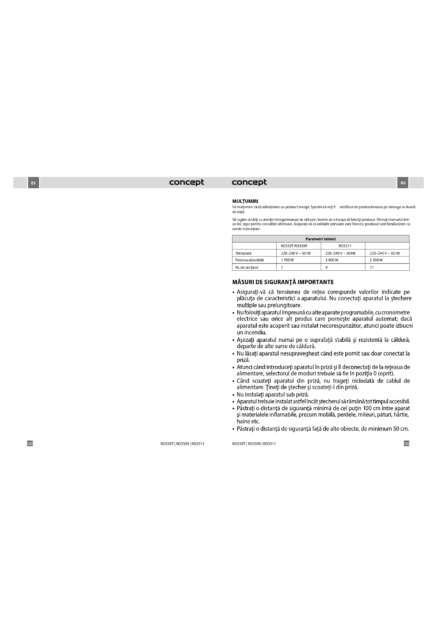 - Păstraţiaparatulcurat.Nu lăsaţiniciunobiectsă intreprin grilăînaparat.Aceastapoateprovocaun scurtcircuit, deteriorareaaparatuluisauunincendiu. VămulţumimcăaţiachiziţionatunprodusConcept.Sperămcăveţi satisfăcutdeprodusulnostrupeîntreagasadurată deviaţă. Vărugămsăcitiţicuatenţieîntregulmanualdeutilizare,înaintedeaîncepesăfolosiţiprodusul.Păstraţimanualulîntr- unlocsigurpentruconsultăriulterioare.Asiguraţi-văcăcelelaltepersoanecarefolosescprodusulsuntfamiliarizatecu acesteinstrucţiuni. MULŢUMIRI RO 3107, RO 3109, RO 3111 Parametri tehnici RO 3207 RO 3209 RO 3211 Tensiunea 230 V ~ 50 Hz 230 V ~ 50 Hz 230 V ~ 50 Hz Puterea absorbită 1500 W 2000 W 2300 W Nr.desecţiuni