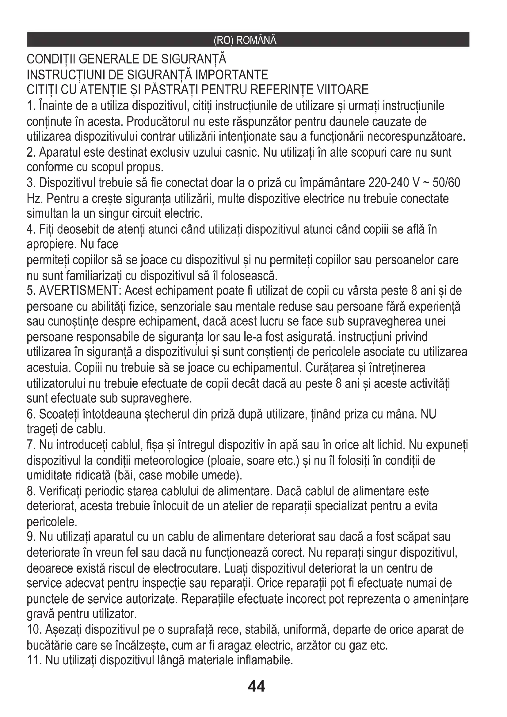 deteriorat, acesta trebuie înlocuit de un atelier de reparații specializat pentru a evita pericolele. deteriorate în vreun fel sau dacă nu funcționează corect. Nu reparați singur dispozitivul, deoarece există riscul de electrocutare. Luați dispozitivul deteriorat la un centru de service adecvat pentru inspecție sau reparații. Orice reparații pot fi efectuate numai de punctele de service autorizate. Reparațiile efectuate incorect pot reprezenta o amenințare gravă pentru utilizator.