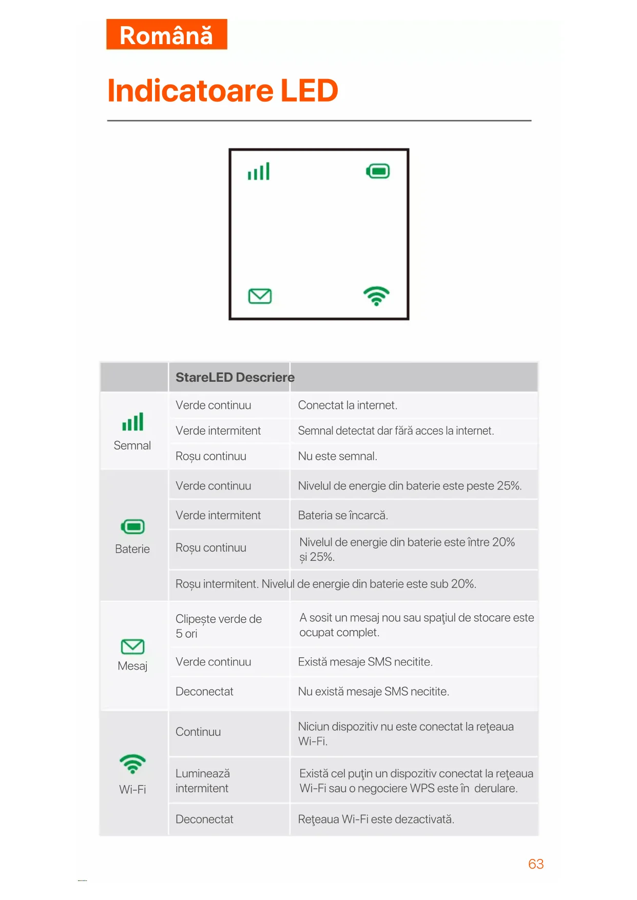 Indicatoare LED StareLED Descriere Verde continuu Verde intermitent Roșu continuu Conectat la internet. Semnal detectat dar fără acces la internet. Nu este semnal. Verde continuu Verde intermitent Roșu continuu Nivelul de energie din baterie este peste 25%. Bateria se încarcă. Clipește verde de 5 ori Verde continuu Deconectat Există mesaje SMS necitite. Nu există mesaje SMS necitite. Continuu Luminează intermitent Deconectat Niciun dispozitiv nu este conectat la reţeaua Wi-Fi. Reţeaua Wi-Fi este dezactivată. Roșu intermitent. Nivelul de energie din baterie este sub 20%. Semnal Baterie Mesaj Wi-Fi Nivelul de energie din baterie este între 20% și 25%. A sosit un mesaj nou sau spaţiul de stocare este ocupat complet. Există cel puţin un dispozitiv conectat la reţeaua Wi-Fi sau o negociere WPS este în derulare.Română