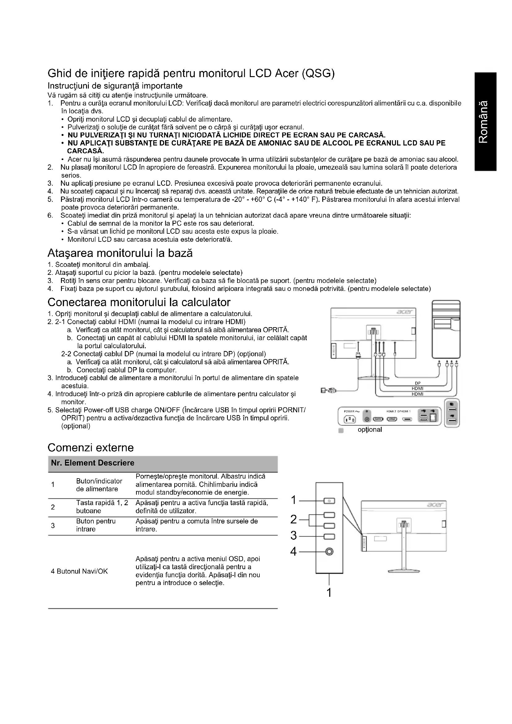 4. Fixaţi baza pe suport cu ajutorul şurubului, folosind aripioara integrată sau o monedă potrivită. (pentru modelele selectate) Conectarea monitorului la calculator 1. Opriţi monitorul şi decuplaţi cablul de alimentare a calculatorului.2. 2-1 Conectaţi cablul HDMI (numai la modelul cu intrare HDMI) a. Verificaţi ca atât monitorul, cât şi calculatorul să aibă alimentarea OPRITĂ. b. Conectaţi un capăt al cablului HDMI la spatele monitorului, iar celălalt capăt la portul calculatorului.2-2 Conectaţi cablul DP (numai la modelul cu intrare DP) (opţional) a. Verificaţi ca atât monitorul, cât şi calculatorul să aibă alimentarea OPRITĂ. b. Conectaţi cablul DP la computer.3. Introduceţi cablul de alimentare a monitorului în portul de alimentare din spatele acestuia.4. Introduceţi într-o priză din apropiere cablurile de alimentare pentru calculator şi monitor. 5. Selectaţi Power-off USB charge ON/OFF (Încărcare USB în timpul opririi PORNIT/ OPRIT) pentru a activa/dezactiva funcţia de încărcare USB în timpul opririi. (opţional) Comenzi externe Nr. Element Descriere