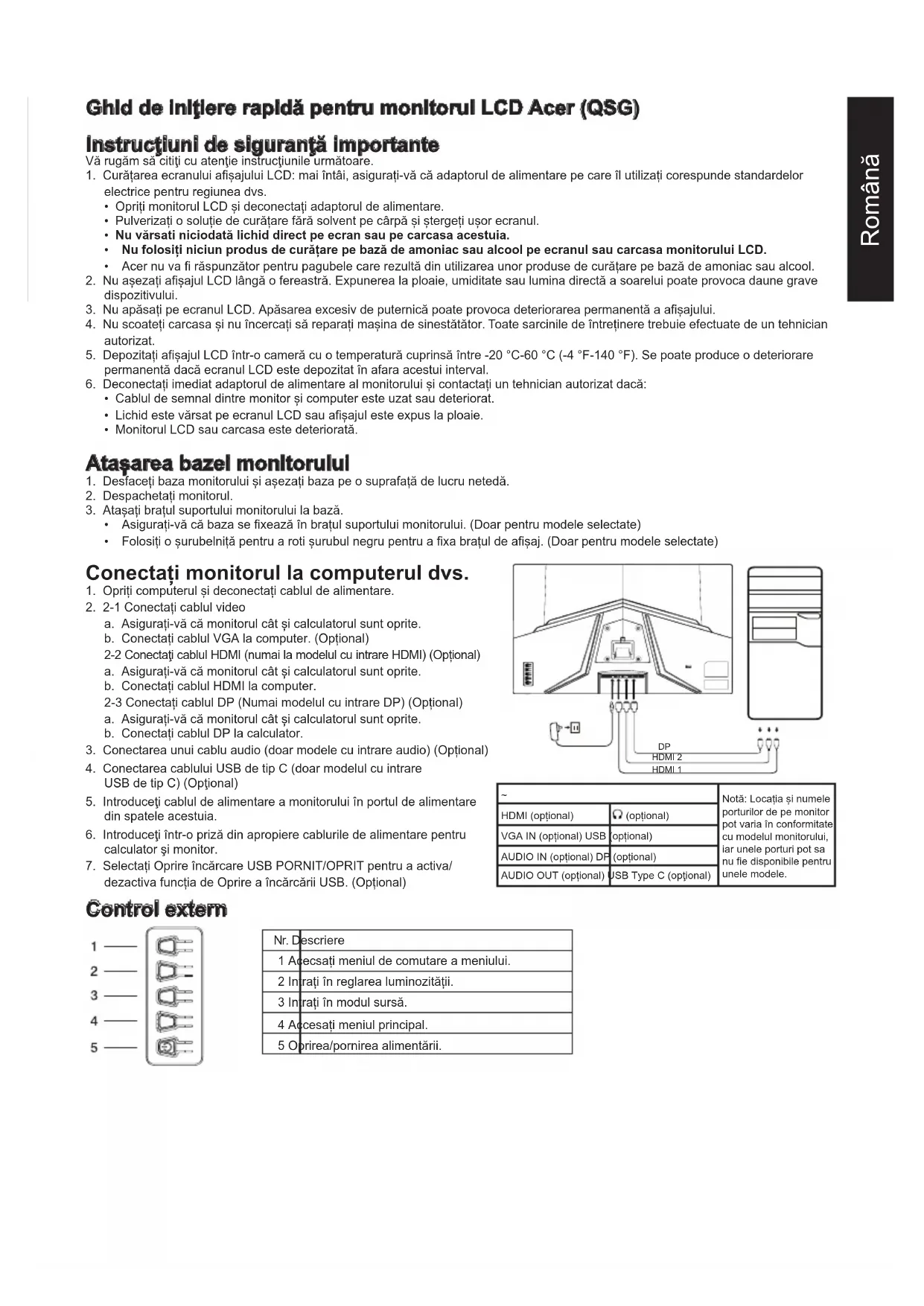 Notă: Locația și numele porturilor de pe monitor pot varia în conformitate cu modelul monitorului, iar unele porturi pot sa nu fie disponibile pentru unele modele. HDMI (opțional) (opțional) VGA IN (opțional) USB (opțional) AUDIO IN (opțional) DP (opțional) AUDIO OUT (opțional) USB Type C (opţional) Control extern Nr. Descriere 1 Acecsați meniul de comutare a meniului. 2 Intrați în reglarea luminozității. 3 Intrați în modul sursă. 4 Accesați meniul principal. 5 Oprirea/pornirea alimentării.Română Declarații de reglementare și siguranță Declarație FCC Acest echipament a fost testat și s-a dovedit că respectă limitele pentru un dispozitiv digital din clasa B, în conformitate cu partea 15 din Regulile FCC. Aceste limite sunt concepute pentru a oferi o protecție rezonabilă împotriva interferențelor dăunătoare atunci când echipamentul este instalat într-o zonă rezidențială. Acest echipament generează, utilizează și poate radia energie de frecvență radio și, dacă nu este instalat și utilizat în conformitate cu instrucțiunile, poate provoca interferențe la comunicațiile radio. Cu toate acestea, nu există nicio garanție că interferența nu va apărea într-o anumită instalație. Dacă dispozitivul provoacă interferențe la recepția radio sau TV (care poate fi determinată de aparatul de comandă), utilizatorului i se recomandă să ia una sau mai multe dintre următoarele măsuri pentru a elimina interferența: