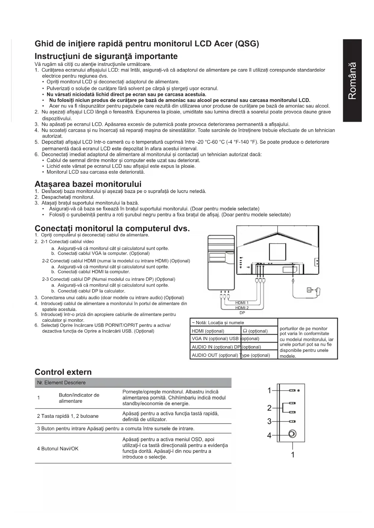 Consum de energie Mod pornit 20 W (tipic) Modul Repaus 0,5 W (tipic) Modul Oprit 0,3 W (tipic) Conector de intrare DP (numai la modelul cu intrare DP) HDMI ×2 (Numai modelul cu intrare HDMI) Semnal video intrare DP (numai la modelul cu intrare DP) HDMI ×2 (Numai modelul cu intrare HDMI) Difuzoare 2 W × 2 USB USB3.0 × 4 (opţional) Dimensiune maximă ecran Orizontal: 597 mm Vertical: 336 mm Sursă de alimentare INTRARE: 100-240 V~ 50/60 Hz Consideraţii de mediu Temperatură de funcţionare: de la 0° la 40°C Temperatură de depozitare: de la -20° la 60°C Umiditate în stare de funcţionare: de la 20% la 80% Dimensiuni 610,5 (L) × 406-556 (H) × 247 (D) mm Greutate (netă) 6,4 kg (net) Specificațiile mecanismului Înclinare: de la -5° la +35° Rotire: ±60° Reglare pe înălţime: 150 mm Pivotare: Nu Suport cu picior detaşabil: Da Controale externe Comutator/Butoane Buton de alimentare Tastă fierbinte 1 Tastă fierbinte 2 Intrare Meniu/Navi/OK Funcţii Luminozitate Contrast Lumină albastră Intensificare albastru ACM Super claritate Gamma Temperatură culoare Moduri Modul sRGB Mod scală gri Nuanţă pe 6 axe Saturaţie pe 6 axe Volum Închide sunetul Epuizare Adaptive Sync Num. rată de reîmprospătare Limbă Expirare timp OSD Transparență Blocare OSD Intrare Pornire automată Mod lat Atribuire tastă fierbinte DDC/CI Nivel de negru HDMI Mod pornire rapidă Oprire încărcare USB Informaţii Specificaţiile variază în funcţie de model şi/sau de regiune. Puteţi găsi manuale şi alte documente pentru produsul dvs. Acer pe site-ul web oficial de asistenţă Acer.Български Ръководство за бърза настройка на LCD монитор Acer Важни инструкции за безопасност Моля, прочетете внимателно следните инструкции.