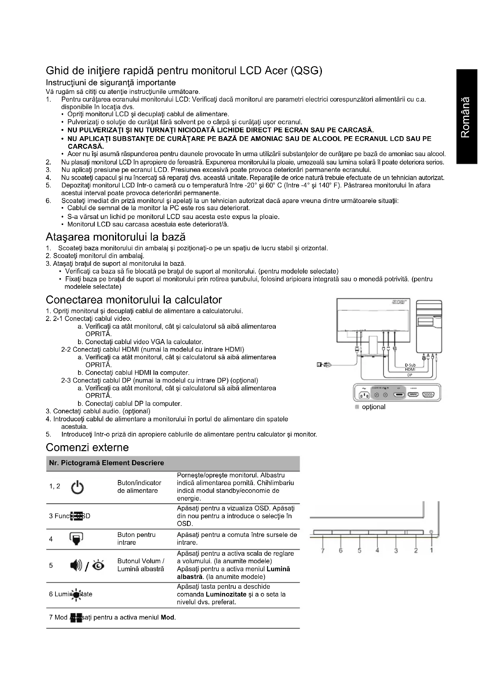 (tipic) Contrast 100.000.000:1 Max (ACM) Unghi de vizualizare 178° (H) 178° (V) (CR=10) 90° (H) 65° (V) (CR=10) Timp de răspuns 4 ms (G - G) 5 ms Tip panou VA TN Video Interfaţă analogică R, G, B Frecvenţă orizontală 30 kHz – 80 kHz Frecvenţă verticală 55 – 75 Hz Culori afişate 16,7 Milioane Frecvenţa de ceas 175 MHz Rezoluţie maximă 1920 x 1080 la 60 Hz Tip plug & play VESA DDCCI/DDC2B Consum de energie (la 200 nits) Modul Pornit 19 W 19 W Modul Repaus 0,5 W 0,5 W Modul Oprit 0,3 W 0,3 W Conector de intrare D-Sub HDMI (numai la modelul cu intrare HDMI) DP (numai la modelul cu intrare DP) (opţional) Semnal video de intrare Analog: 0,7 Vp-p (standard), 75 OHM, pozitiv HDMI (numai la modelul cu intrare HDMI) (opţional) DP (numai la modelul cu intrare DP) (opţional) Difuzoare 1 W x 2 (opţional) Dimensiune maximă ecran Orizontal: 476,6 mm Vertical: 268,1 mm Sursă de alimentare 100–240 V, 50/60 Hz Consideraţii privind mediul Temperatură de funcţionare: 5° – 35°C Temperatură de depozitare: -20° – 60°C Umiditate de funcţionare: 10% – 85% Dimensiuni 508 (l) x 390,5 (h) x 207 (a) mm Greutate (netă) 3,1 kg (net) Specificaţii privind mecanismul Înclinare: -5° - +25° Rotire: Nu Reglarea înălţimii: Nu Pivotare: Nu Suport cu picior detaşabil: Da Comenzi externe Comutator/butoane Buton de alimentare MENIU/ENTER Intrare Butonul Volum/Lumină albastră Luminozitate Mod Funcţii Luminozitate Contrast Lumină albastră ACM Poziţie orizontală (numai la modelul cu intrare analogică) Poziţie verticală (numai la modelul cu intrare analogică) Focalizare (numai la modelul cu intrare analogică) Ceas (numai la modelul cu intrare analogică) Configurare automată (numai la modelul cu intrare analogică) Gamma Temperatură culoare sRGB Nuanţe pe 6 axe Saturaţie pe 6 axe Volum (opţional) Limbă Expirare OSD Intrare Format DP (opţional) Modul Wide Sursă automată Over Drive (opţional) Asignare scurtătură DDC/CI Modul Pornire rapidă Informaţii monitor Resetare toate setările Specificaţiile variază în funcţie de model şi/sau de regiune.Български Ръководство за бърза настройка на LCD монитор Acer Важни инструкции за безопасност Моля, прочетете внимателно следните инструкции.