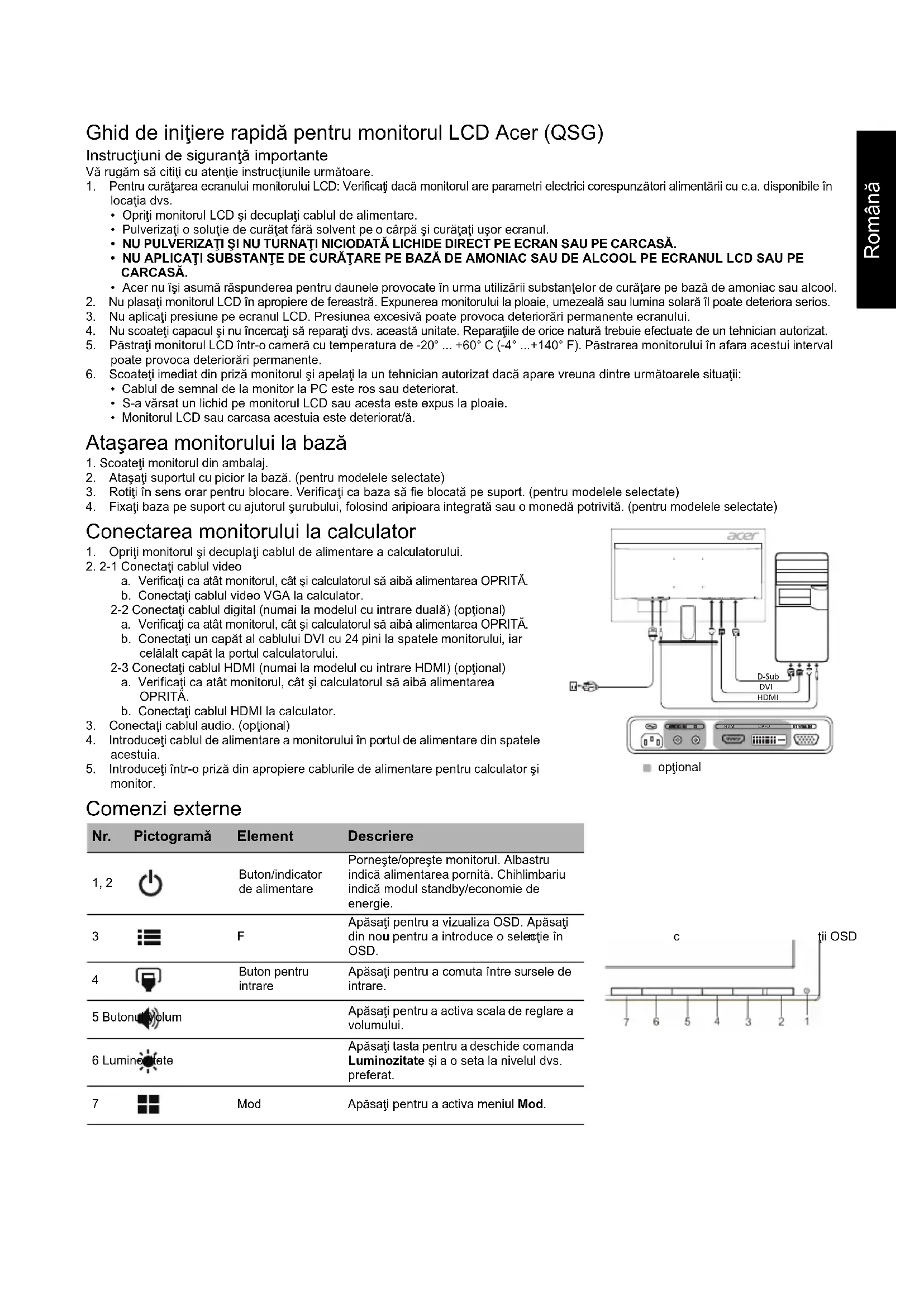 (tipic) Contrast 100.000.000:1 Max (ACM) Unghi de vizualizare 178° (H) 178° (V) (CR=10) Timp de răspuns 4 ms (G - G) Tip panou VA Video Interfaţă analogică R, G, B Frecvenţă orizontală 31 kHz – 83 kHz Frecvenţă verticală 56 – 76 Hz Culori afişate 16,7 milioane de culori Frecvenţa de ceas VGA/HDMI: 170 MHz DVI: 165 MHz Rezoluţie maximă 1920 x 1080 la 60 Hz Tip plug & play VESA DDCCI/DDC2B Clasa de eficienţă energetică B *Consum anual de energie 38 (kWh) (pentru modelul cu intrare HDMI) Consum de energie (la 200 nits) Modul Pornit 21 W (tipic) Modul Repaus 0,5 W (tipic) Modul Oprit 0,35 W (tipic) Conector de intrare D-Sub DVI-D 24 pini (numai la modelul cu intrare duală) (opţional) HDMI (numai la modelul cu intrare HDMI) (opţional) Semnal video de intrare Analog: 0,7 Vp-p (standard), 75 OHM, pozitiv Semnal digital (numai la modelul cu intrare duală) (opţional) HDMI (numai la modelul cu intrare HDMI) (opţional) Difuzoare 2 W x 2 (opţional) Dimensiune maximă ecran Orizontal: 534,74 mm Vertical: 313,26 mm Sursă de alimentare 100-240 V, 50/60 Hz Consideraţii privind mediul Temperatură de funcţionare: 0° – 40°C Temperatură de depozitare: -20° – 60°C Umiditate de funcţionare: 20% – 80% Dimensiuni 539,9 (l) x 409,4 (h) x 207,4 (a) mm Greutate (netă) 3,91 kg (net) Specificaţii privind mecanismul Înclinare: -5° – +25° (Numai în punctul cel mai înalt unghiul de ridicare poate fi de 25 grade înclinare) Rotire: Nu Reglarea înălţimii: Nu Pivotare: Nu Suport cu picior detaşabil: Da (suport cu picior detaşabil cu prindere cu şurub) Comenzi externe Comutator/butoane Buton de alimentare MENIU/ENTER Intrare Volum Luminozitate Mod Funcţii Luminozitate Contrast Lumină albastră ACM Poziţie orizontală (numai la modelul cu intrare analogică) Poziţie verticală (numai la modelul cu intrare analogică) Focalizare (numai la modelul cu intrare analogică) Ceas (numai la modelul cu intrare analogică) Configurare automată (numai la modelul cu intrare analogică) Gamma Temperatură culoare Modul sRGB Nuanţe pe 6 axe Saturaţie pe 6 axe Volum Limbă Expirare OSD Intrare Sursă automată Over Drive Asignare scurtătură Modul Wide DDC/CI Modul Pornire rapidă Informaţii monitor Resetare toate setările Toate specificaţiile pot fi schimbate fără notificare prealabilă.Български Ръководство за бърза настройка на LCD монитор Acer Важни инструкции за безопасност Моля, прочетете внимателно следните инструкции. 1. За да почистите екрана на вашия LCD монитор: не забравяйте, че вашият монитор е предназначен за работа с променливотоково захранване във вашия регион.