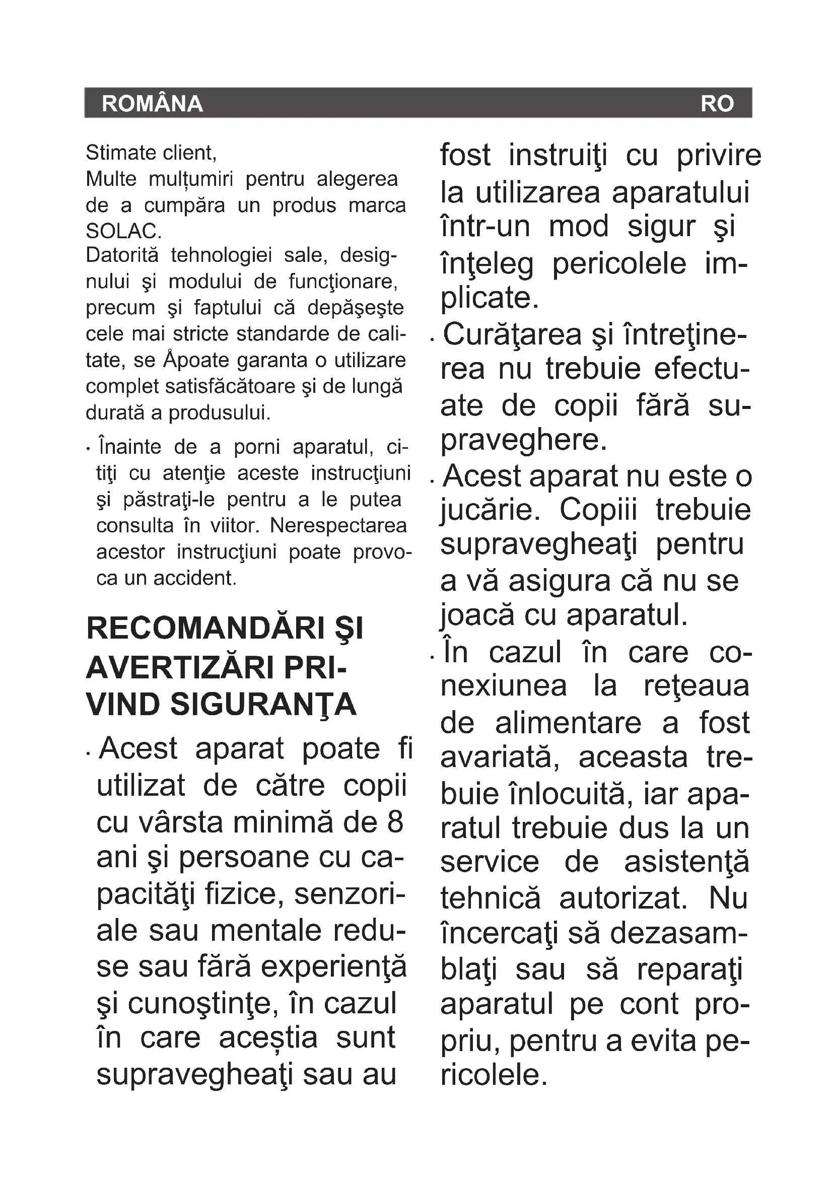 Stimate client, Multe mulțumiri pentru alegerea de a cumpăra un produs marca SOLAC. Datorită tehnologiei sale, desig- nului şi modului de funcţionare, precum şi faptului că depăşeşte cele mai stricte standarde de cali- tate, se Åpoate garanta o utilizare complet satisfăcătoare şi de lungă durată a produsului.