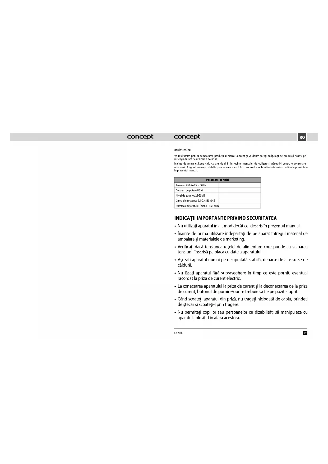 CA2000 Mulțumire Vă mulțumim pentru cumpărarea produsului marca Concept și vă dorim să ți mulțumiți de produsul nostru pe întreaga durată de utilizare a acestuia. Înainte de prima utilizare citiți cu atenție și în întregime manualul de utilizare și păstrați-l pentru o consultare ulterioară. Asigurați-vă că și celelalte persoane care vor folosi produsul sunt familiarizate cu instrucțiunile prezentate în prezentul manual. Parametri tehnici Tensiune 220-240 V ~ 50 Hz Consum de putere 80 W Nivel de zgomot 28-55 dB Gama de frecvențe 2,4-2,4835 GHZ Puterea emițătorului (max.) 16,66 dBm