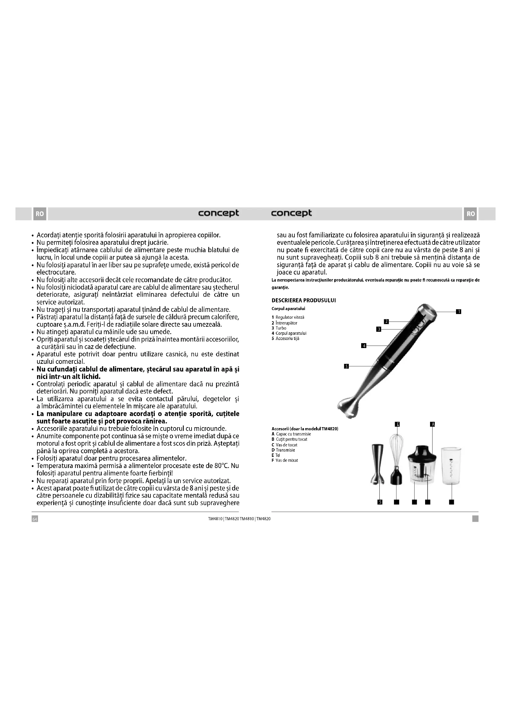 - Persoanele cu capacitatea motrică și percepția simțului redusă, cu capacitatea intelectuală insucientă sau persoanele nefamiliarizate cu deservirea trebuie să folosească aparatul doar sub supravegherea unei persoane responsabile și familiarizate cu deservirea.64 65 RORO TM4810 | TM4820 TM4810 | TM4820 sau au fost familiarizate cu folosirea aparatului în siguranță și realizează eventualele pericole. Curățarea și întreținerea efectuată de către utilizator nu poate exercitată de către copii care nu au vârsta de peste 8ani și nu sunt supravegheați. Copiii sub 8 ani trebuie să mențină distanța de siguranță față de aparat și cablu de alimentare. Copiii nu au voie să se joace cu aparatul. La nerespectarea instrucțiunilor producătorului, eventuala reparație nu poate recunoscută ca reparație de garanție. DESCRIEREA PRODUSULUI Corpul aparatului 1 Regulator viteză 2 Întrerupător 3 Turbo 4 Corpul aparatului 5 Accesoriu tijă Accesorii (doar la modelul TM4820) A Capac cu transmisie B Cuțit pentru tocat C Vas de tocat D Transmisie E Tel F Vas de mixat
