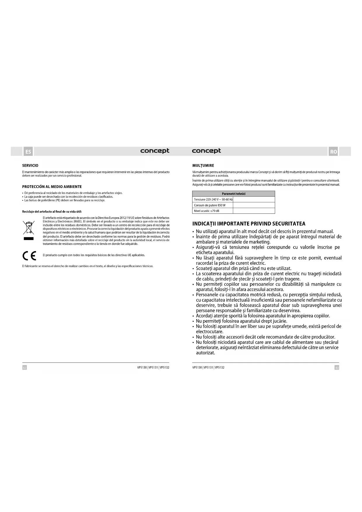 - Nu folosiți niciodată aparatul care are cablul de alimentare sau ștecărul deteriorate, asigurați neîntârziat eliminarea defectului de către un service autorizat.84 85 RORO VP5130 | VP5131 | VP5132 VP5130 | VP5131 | VP5132