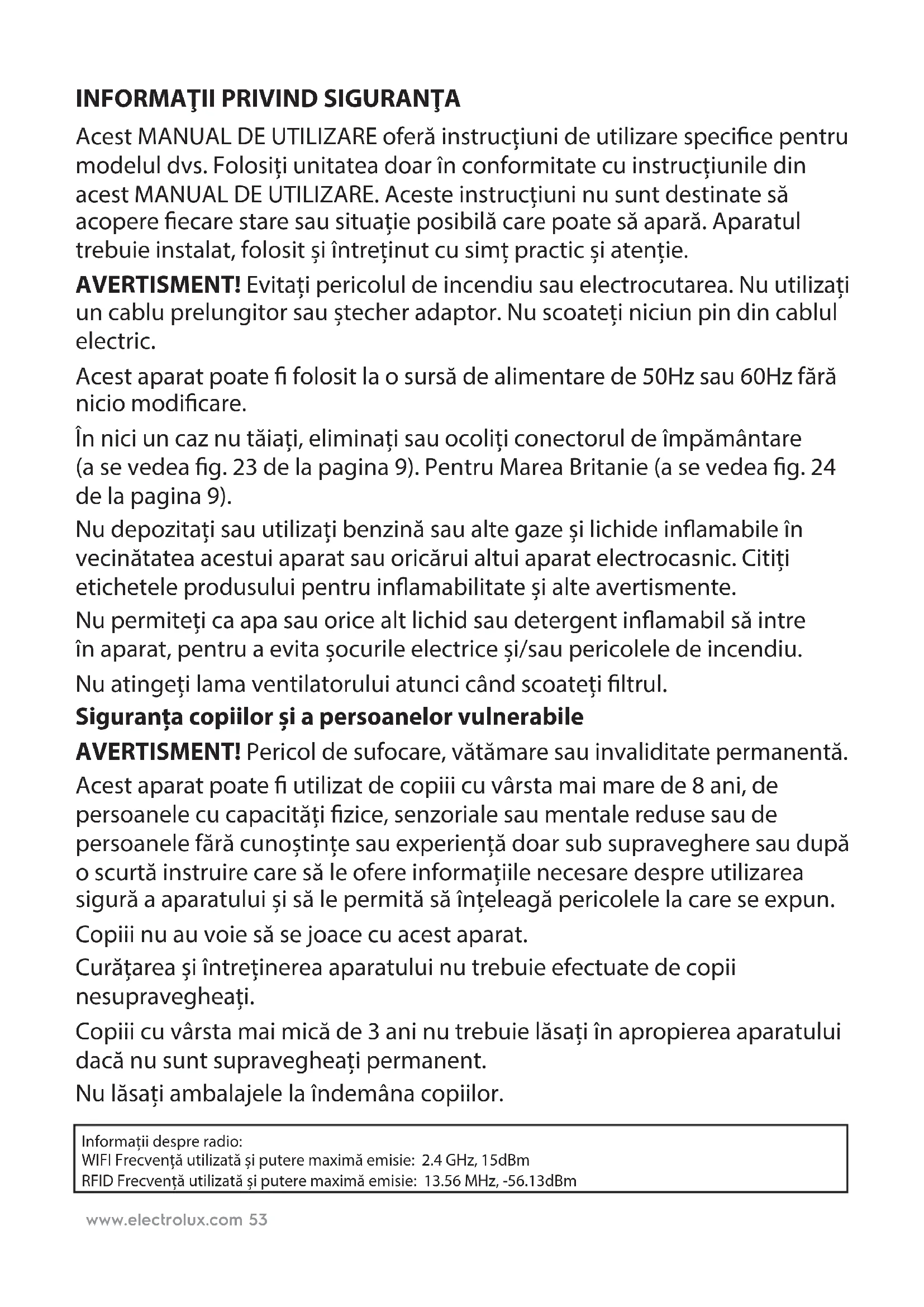 Acest MANUAL DE UTILIZARE oferă instrucțiuni de utilizare specice pentru modelul dvs. Folosiți unitatea doar în conformitate cu instrucțiunile din acest MANUAL DE UTILIZARE. Aceste instrucțiuni nu sunt destinate să acopere ecare stare sau situație posibilă care poate să apară. Aparatul trebuie instalat, folosit și întreținut cu simț practic și atenție. AVERTISMENT! Evitați pericolul de incendiu sau electrocutarea. Nu utilizați un cablu prelungitor sau ștecher adaptor. Nu scoateți niciun pin din cablul electric. Acest aparat poate folosit la o sursă de alimentare de 50Hz sau 60Hz fără nicio modicare. În nici un caz nu tăiați, eliminați sau ocoliți conectorul de împământare (ase vedea g. 23 de la pagina 9). Pentru Marea Britanie (a se vedea g. 24 de la pagina 9). Nu depozitați sau utilizați benzină sau alte gaze și lichide inamabile în vecinătatea acestui aparat sau oricărui altui aparat electrocasnic. Citiți etichetele produsului pentru inamabilitate și alte avertismente. Nu permiteți ca apa sau orice alt lichid sau detergent inamabil să intre înaparat, pentru a evita șocurile electrice și/sau pericolele de incendiu. Nu atingeți lama ventilatorului atunci când scoateți ltrul. Siguranța copiilor și a persoanelor vulnerabile AVERTISMENT! Pericol de sufocare, vătămare sau invaliditate permanentă. Acest aparat poate utilizat de copiii cu vârsta mai mare de 8 ani, de persoanele cu capacități zice, senzoriale sau mentale reduse sau de persoanele fără cunoștințe sau experiență doar sub supraveghere sau după o scurtă instruire care să le ofere informațiile necesare despre utilizarea sigură a aparatului și să le permită să înțeleagă pericolele la care se expun. Copiii nu au voie să se joace cu acest aparat. Curățarea și întreținerea aparatului nu trebuie efectuate de copii nesupravegheați. Copiii cu vârsta mai mică de 3 ani nu trebuie lăsați în apropierea aparatului dacă nu sunt supravegheați permanent. Nu lăsați ambalajele la îndemâna copiilor. Informații despre radio: WIFI Frecvență utilizată și putere maximă emisie: 2.4 GHz, 15dBm RFID Frecvență utilizată și putere maximă emisie: 13.56 MHz, -56.13dBmwww.electrolux.com54 Informații privind alimentarea electrică AVERTISMENT! Evitați pericolul de incendiu sauelectrocutarea. Dacă nu sunteți siguri că priza este împământată corespunzător sau că este protejată de o siguranță cu temporizator sau întrerupător, apelați la un tehnician calicat, care să instaleze o priză adecvată conform standardelor naționale privind instalațiile electrice șiacodurilor și a regulamentelor locale în vigoare. Nu utilizați un cablu prelungitor sau ștecher adaptor. Nu deconectați niciodată unitatea trăgând de cablul electric. Prindeți întotdeauna ștecherul ferm și trageți-l afară din priză. Nu apăsați, îndoiți sau înnodați cablul electric. Nu tăiați sau deteriorați cablul electric. În cazul în care cablul electric este deteriorat, acesta trebuie înlocuit doar la un service autorizat Electrolux. Acest aparat nu conține piese care pot reparate de utilizator. Apelați întotdeauna la un service Electrolux autorizat pentru reparații. Dacă e deteriorat cablul de alimentare, acesta trebuie înlocuit de către producător, de agentul de service al acestuia sau de o persoană calicată corespunzător, pentru a se evita pericolele. Scoateți din priză unitatea înainte de a o curăța, pentru aevita electrocutarea sau pericolele de incendiu. ROMÂNĂ Vă mulțumim pentru că ați ales puricatorul de aer Electrolux PURE A9-40/PURE A9-60. Pentru cele mai bune rezultate, folosiți întotdeauna accesorii și piese de schimb originale. Acest produs este conceput luând în calcul protecția mediului. Toate piesele din plastic sunt marcate în scopul reciclării.