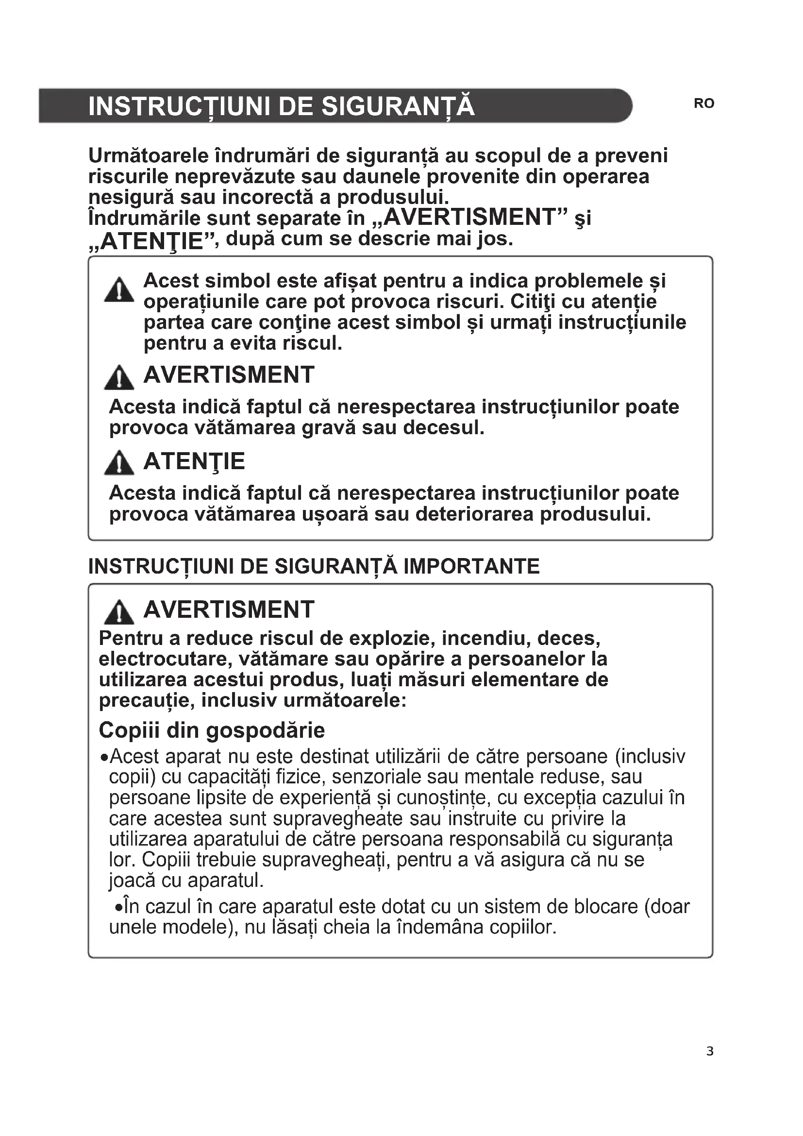 AVERTISMENT Pentru a reduce riscul de explozie, incendiu, deces, electrocutare, vătămare sau opărire a persoanelor la utilizarea acestui produs, luați măsuri elementare de precauție, inclusiv următoarele: Copiii din gospodărie