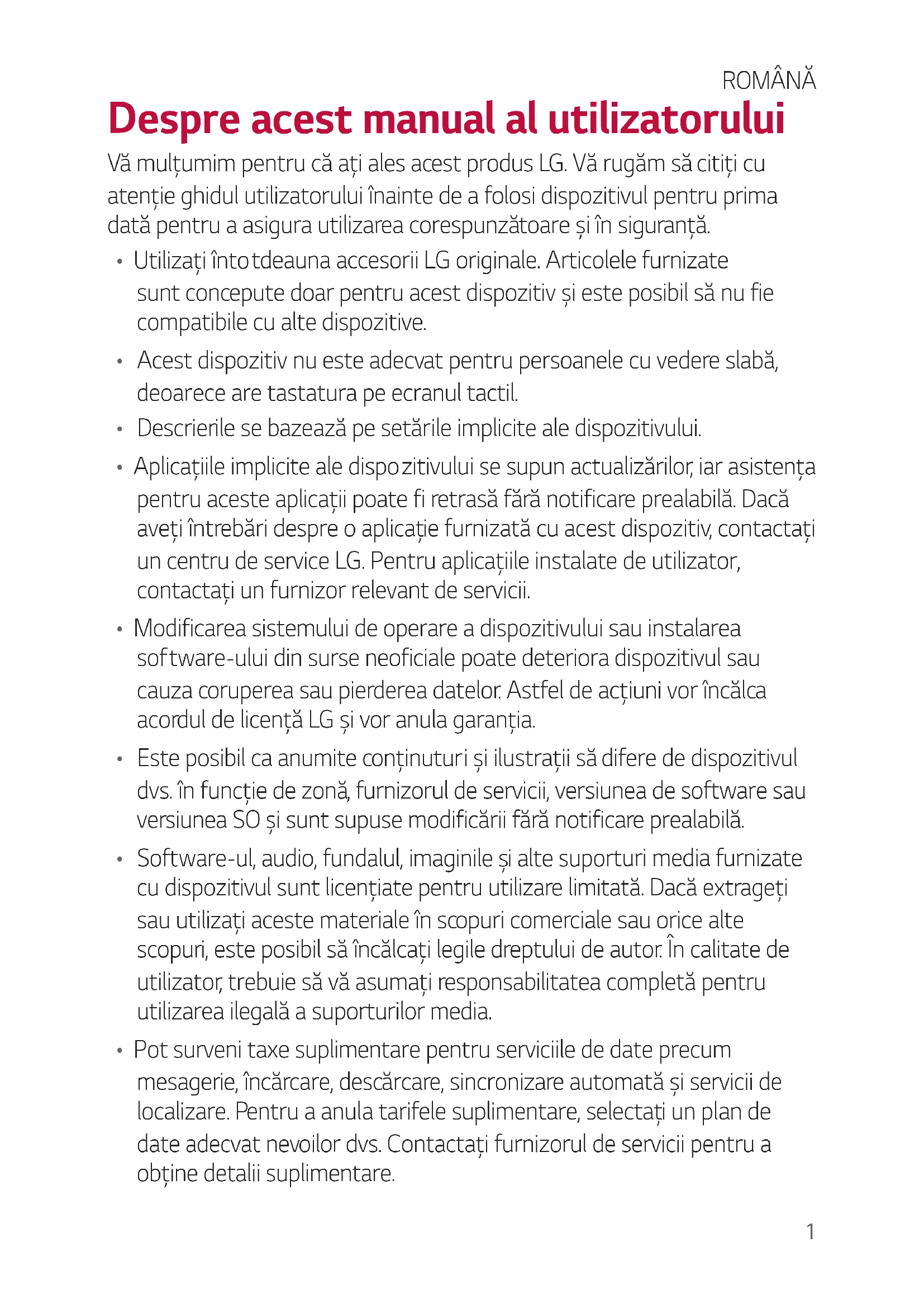- Modificarea sistemului de operare a dispozitivului sau instalarea sof tware-ului din surse neoficiale poate deteriora dispozitivul sau cauza coruperea sau pierderea datelor. Astfel de acțiuni vor încălca acordul de licență LG și vor anula garanția.