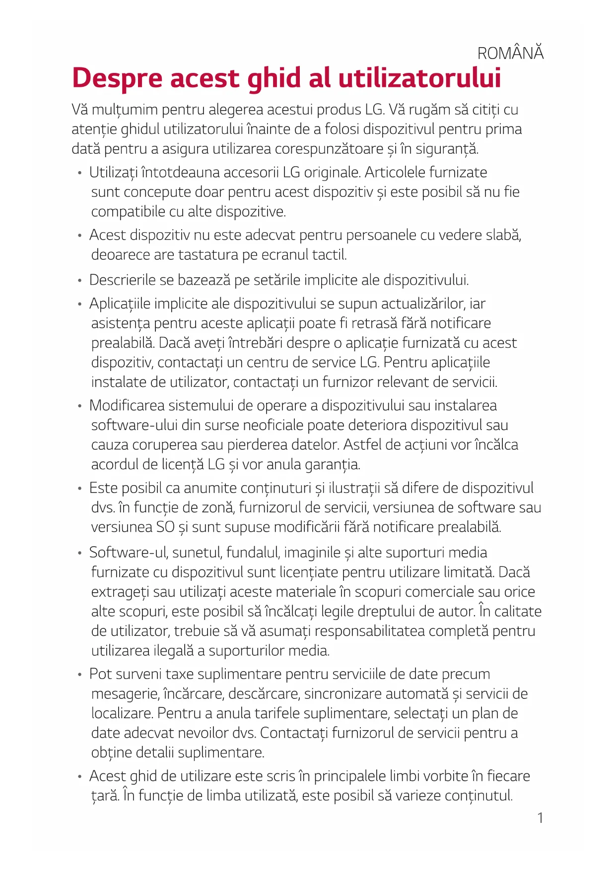- Modificarea sistemului de operare a dispozitivului sau instalarea software-ului din surse neoficiale poate deteriora dispozitivul sau cauza coruperea sau pierderea datelor. Astfel de acțiuni vor încălca acordul de licență LG și vor anula garanția.