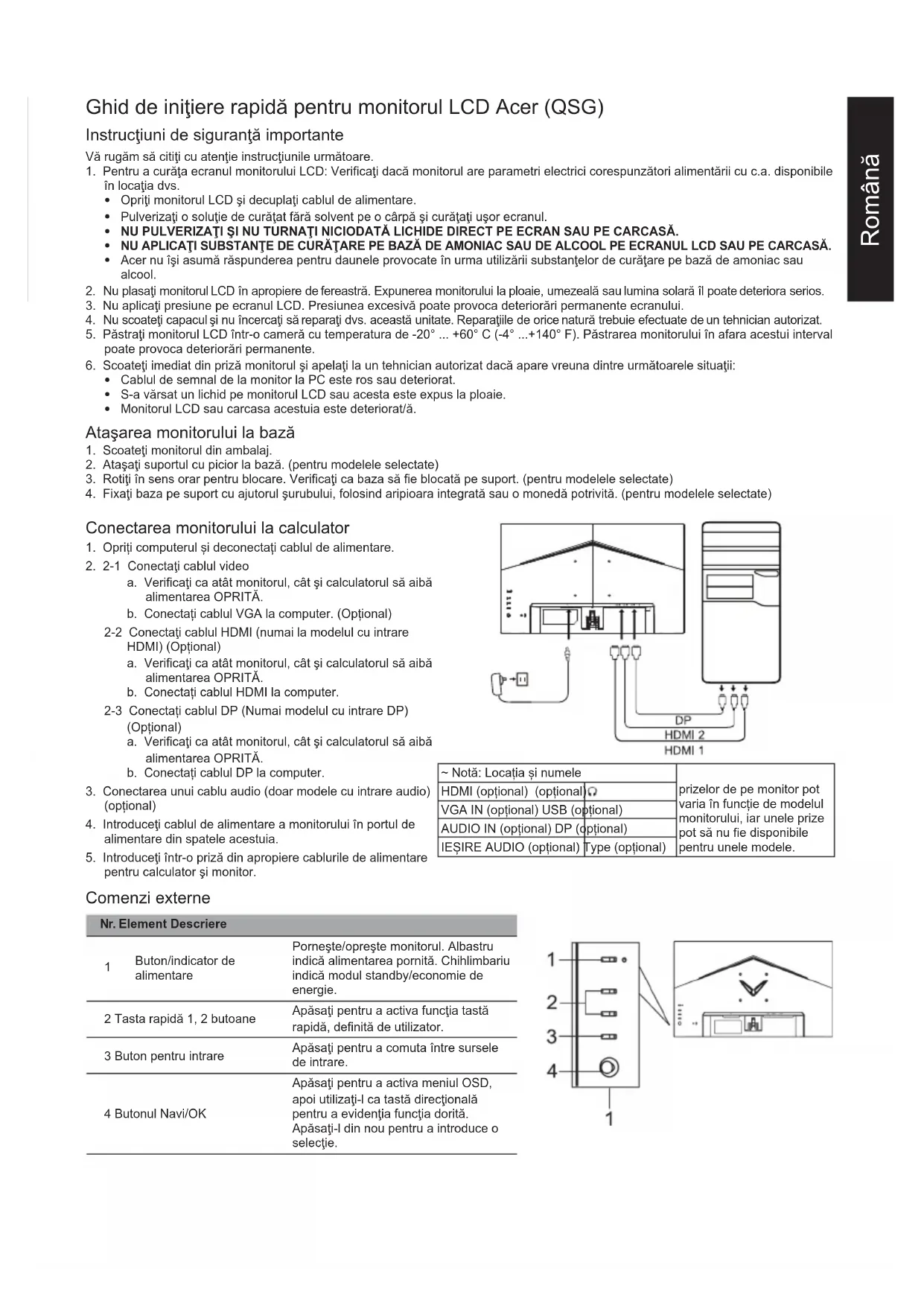 HDMI (numai la modelul cu intrare HDMI) (opţional) Difuzoare 2 W x 2 (numai la modelul cu intrare audio) (opţional) Dimensiune maximă ecran Orizontală: 527 mm Verticală: 296 mm Sursă de alimentare INTRARE: 100-240 V, 50/60 Hz Consideraţii privind mediul Temp. de funcţionare: 0 ° - 40 °C Temp. de depozitare: -20 ° - 60 °C Umiditate în timpul funcţionării: 20% - 80% Dimensiuni 540,3 (l) x 412,1 (h) x 221,3 (a) mm Masa (netă) 3,00 kg (net) Specicaţii privind mecanismul Înclinare: -5° - +20° Rotire: Nu Reglarea înălţimii: Nu Pivotare: Nu Suport cu picior detaşabil: Da Comenzi externe Comutator/butoane Buton de alimentare Tasta rapidă 1 Tasta rapidă 2 Intrare Meniu/Navi/OK Funcţii Luminozitate Contrast Lumină albastră Amplicare negru ACM HDR Claritate superioară Gamă Temperatură culoare Moduri Spațiul de culoare Mod Tonuri de gri Nuanţe pe 6 axe Saturaţie pe 6 axe Volum Fără sunet Over Drive FreeSync Premium VRB Latență ultra-joasă Frecvenţă reîmprospătare Punct țintă Limbă Expirare OSD Transparenţă Blocare OSD Intrare Sursă automată Mod lat Atribuire tastă rapidă DDC/CI Nivel de negru HDMI Modul Pornire rapidă Informații Resetați toate setările Specicaţiile variază în funcţie de model şi/sau de regiune. Găsiţi manuale şi alte documente pentru produsul dvs. Acer pe website-ul de asistenţă ocial al Acer. *Consumul anual de energie este calculat pe baza unui consum de energie tipic de 4 ore pe zi, 365 zile pe an.Български Ръководство за бърза настройка на LCD монитор Acer Важни инструкции за безопасност Моля, прочетете внимателно следните инструкции.