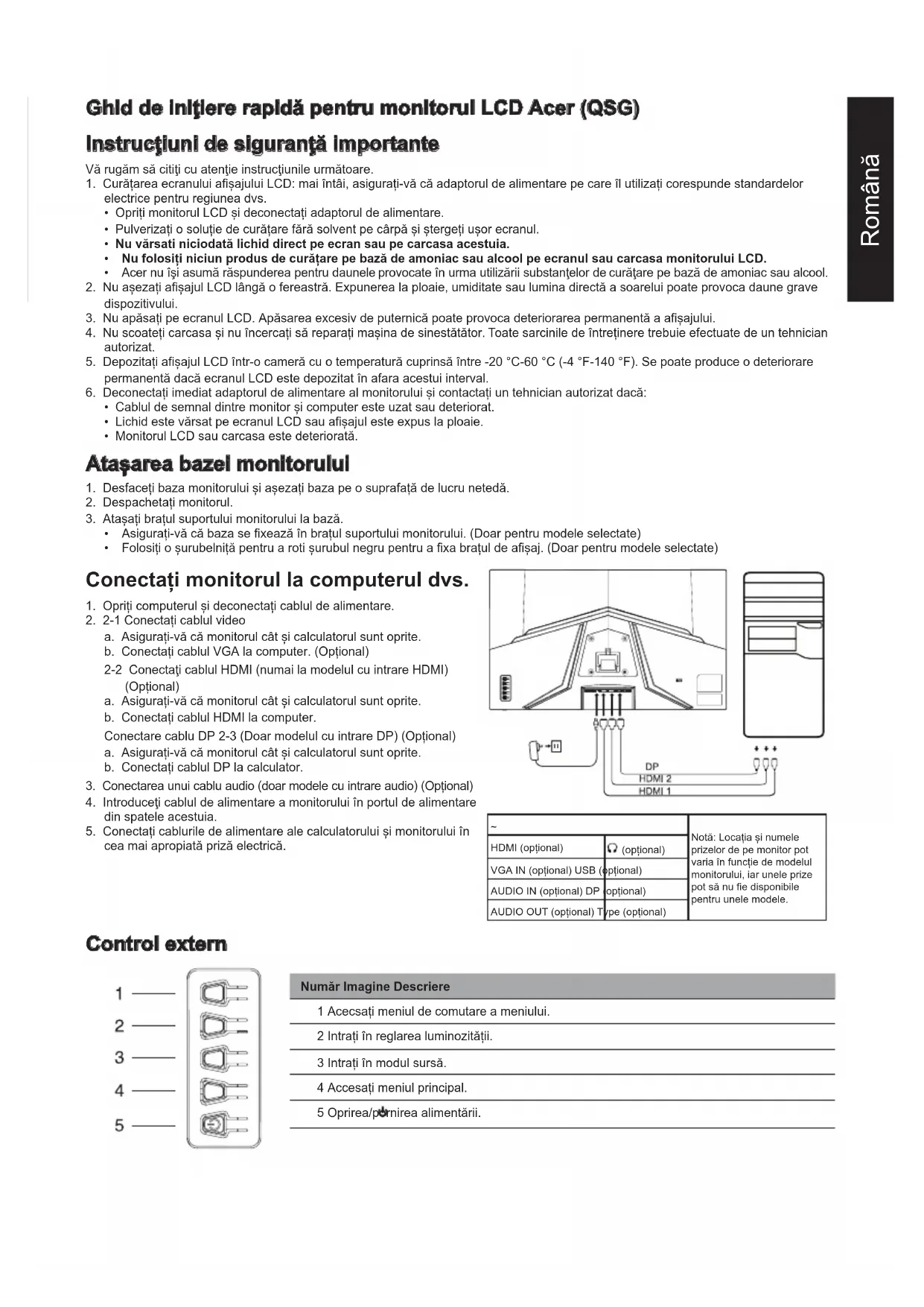 HDMI (doar model cu intrare HDMI) (opțional) Difuzoare 2 W x 2 (numai la modelul cu intrare audio) (opţional) Dimensiune maximă ecran Orizontală: 698 mm Verticală: 393 mm Sursă de alimentare INTRARE: 100-240 V ~ 50/60 Hz Consideraţii privind mediul Temp. de funcţionare: 0 ° - 40 °C Temp. de depozitare: -20 ° - 60 °C Umiditate în timpul funcţionării: 20% - 80% Dimensiuni 713 (L) x 512,5 (H) x 198,6 (D) mm Greutate (netă) 5 kg (net) Specicaţii privind mecanismul Înclinare: -5° - +20° Rotire: Nu Reglarea înălţimii: Nu Pivotare: Nu Suport cu picior detaşabil: Nu Comenzi externe Comutator/butoane Buton de alimentare Tasta rapidă 1 Tasta rapidă 2 Tasta rapidă 3 Tasta rapidă 4 Funcţii Luminozitate Contrast Lumină albastră Intensicare albastru ACM HDR10 Claritate superioară Gamă Temperatură culoare Moduri Spațiul de culoare Mod Tonuri de gri Nuanţă pe 6 axe Saturaţie pe 6 axe Volum Fără sunet Over Drive FreeSync Premium VRB Latență ultra-joasă Num. rată de reîmprospătare Punct țintă Limbă Expirare OSD Transparenţă Blocare OSD Intrare Sursă automată Format DP Mod lat Atribuire tastă rapidă DDC/CI Nivel de negru HDMI Modul Pornire rapidă Informații Resetați toate setările Specicaţiile variază în funcţie de model şi/sau de regiune. Găsiţi manuale şi alte documente pentru produsul dvs. Acer pe website-ul de asistenţă oficial al Acer.Български Ръководство за бърза настройка на LCD монитор Acer Важни инструкции за безопасност Моля, прочетете внимателно следните инструкции.