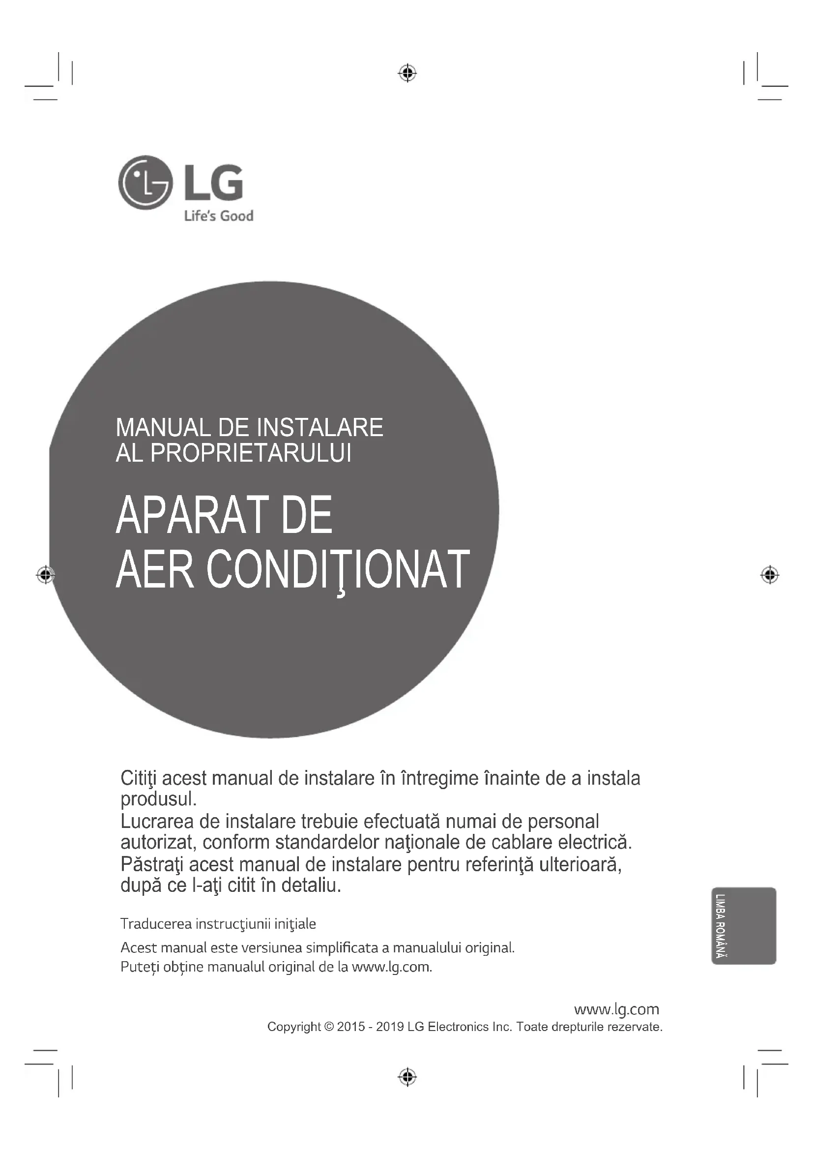 Citiţi acest manual de instalare în întregime înainte de a instala produsul. Lucrarea de instalare trebuie efectuată numai de personal autorizat, conform standardelor naţionale de cablare electrică. Păstraţi acest manual de instalare pentru referinţă ulterioară, după ce l-aţi citit în detaliu. Copyright © 2015 - 2019 LG Electronics Inc. Toate drepturile rezervate.