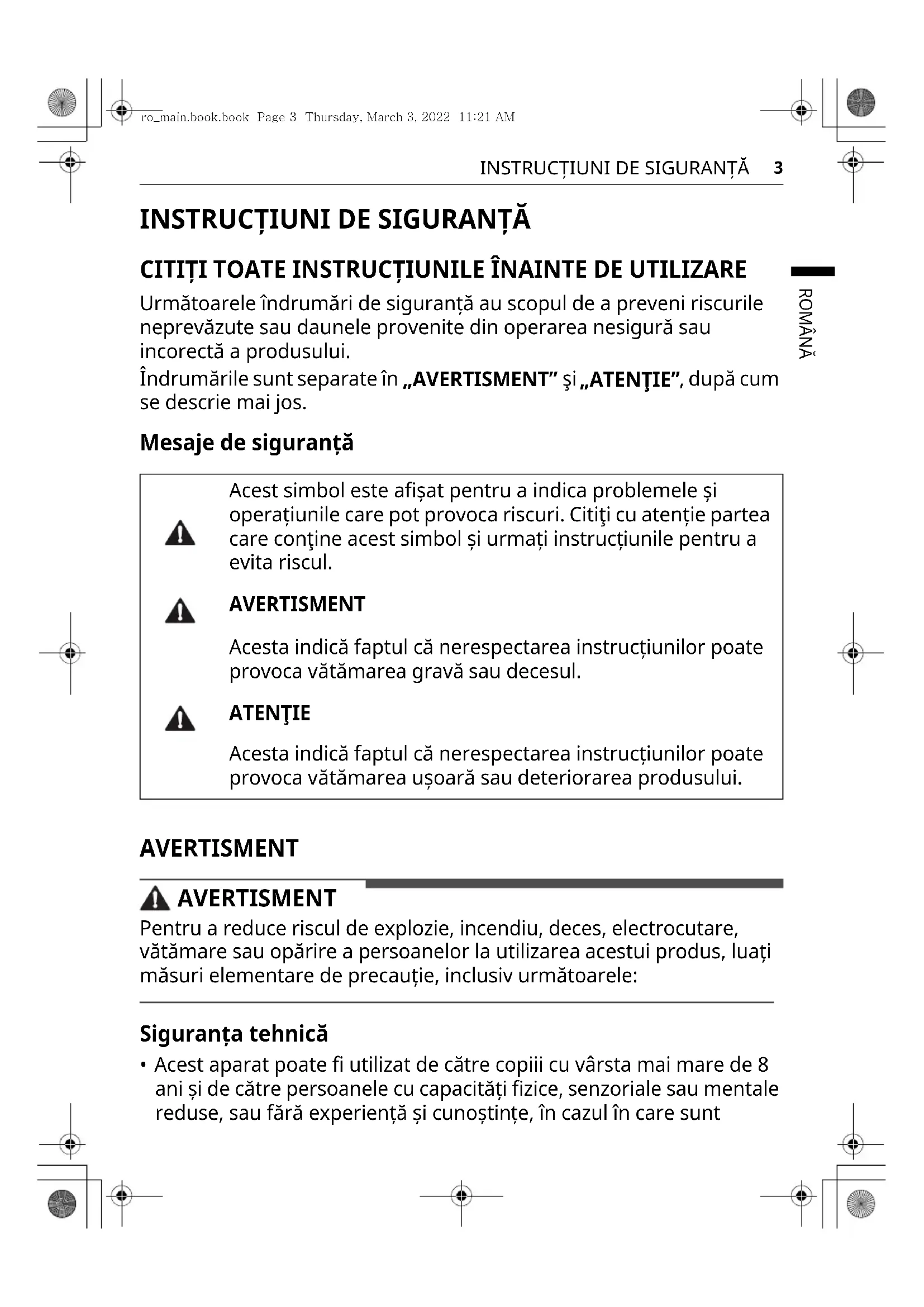 - Acest aparat poate fi utilizat de către copiii cu vârsta mai mare de 8 ani și de către persoanele cu capacități fizice, senzoriale sau mentale reduse, sau fără experiență și cunoștințe, în cazul în care sunt Acest simbol este afișat pentru a indica problemele și operațiunile care pot provoca riscuri. Citiţi cu atenție partea care conţine acest simbol și urmați instrucțiunile pentru a evita riscul. AVERTISMENT Acesta indică faptul că nerespectarea instrucțiunilor poate provoca vătămarea gravă sau decesul. ATENŢIE Acesta indică faptul că nerespectarea instrucțiunilor poate provoca vătămarea ușoară sau deteriorarea produsului. ro_main.book.book Page 3 Thursday, March 3, 2022 11:21 AM4