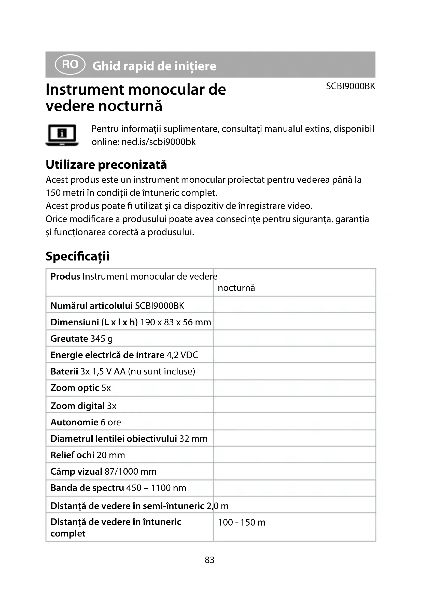 Ghid rapid de inițiere Instrument monocular de vedere nocturnă SCBI9000BK Pentru informații suplimentare, consultați manualul extins, disponibil online: ned.is/scbi9000bk Utilizare preconizată Acest produs este un instrument monocular proiectat pentru vederea până la 150 metri în condiții de întuneric complet. Acest produs poate utilizat și ca dispozitiv de înregistrare video. Orice modicare a produsului poate avea consecințe pentru siguranța, garanția și funcționarea corectă a produsului. Specicaţii Produs Instrument monocular de vedere nocturnă Numărul articolului SCBI9000BK Dimensiuni (L x l x h) 190 x 83 x 56 mm Greutate 345 g Energie electrică de intrare 4,2 VDC Baterii 3x 1,5 V AA (nu sunt incluse) Zoom optic 5x Zoom digital 3x Autonomie 6 ore Diametrul lentilei obiectivului 32 mm Relief ochi 20 mm Câmp vizual 87/1000 mm Banda de spectru 450 – 1100 nm Distanță de vedere în semi-întuneric 2,0 m Distanță de vedere în întuneric complet