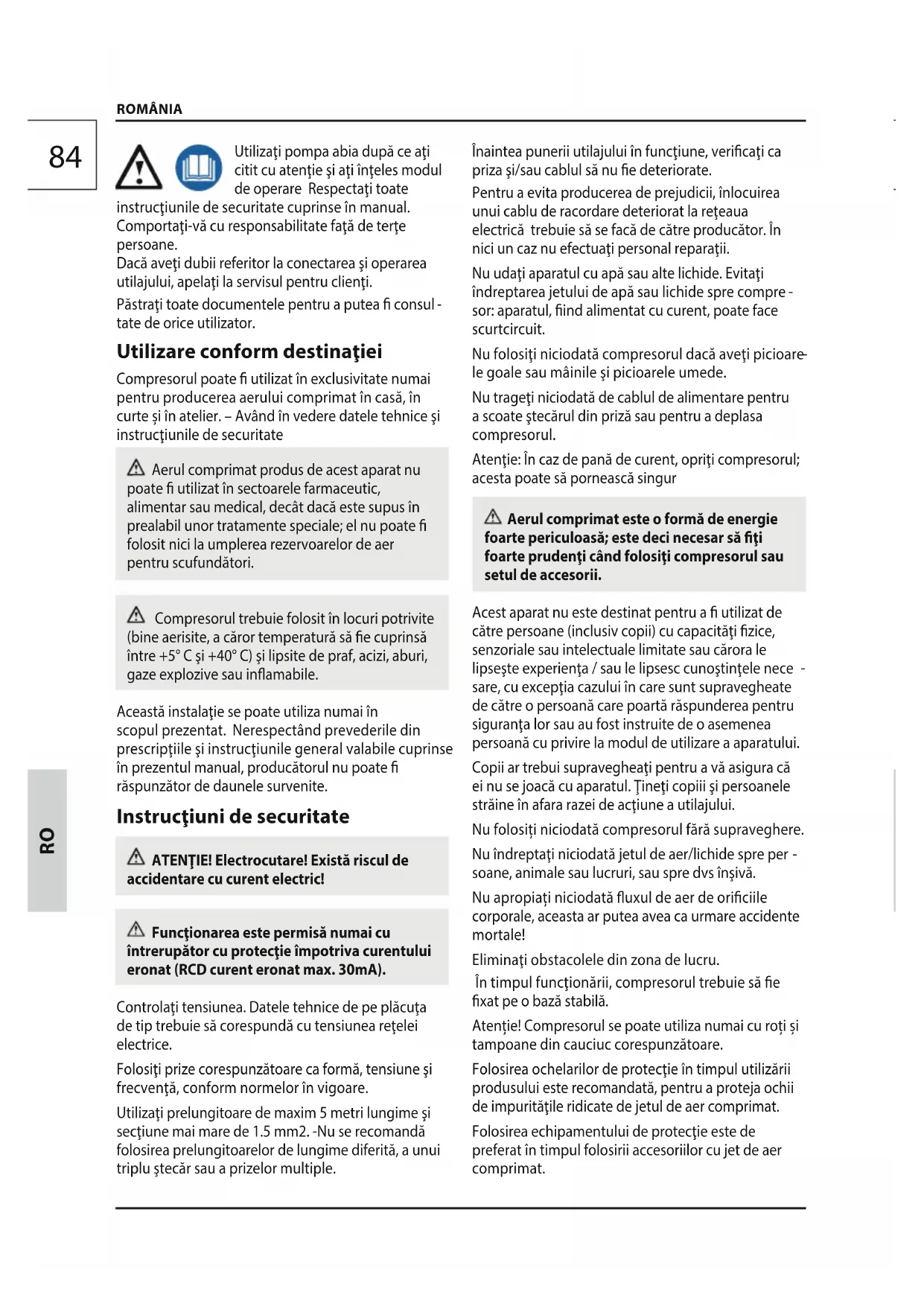 tate de orice utilizator. Utilizare conform destinaţiei Compresorul poate utilizat în exclusivitate numai pentru producerea aerului comprimat în casă, în curte și în atelier. – Având în vedere datele tehnice şi instrucţiunile de securitate Aerul comprimat produs de acest aparat nu poate utilizat în sectoarele farmaceutic, alimentar sau medical, decât dacă este supus în prealabil unor tratamente speciale; el nu poate folosit nici la umplerea rezervoarelor de aer pentru scufundători. Compresorul trebuie folosit în locuri potrivite (bine aerisite, a căror temperatură să e cuprinsă între +5° C şi +40° C) şi lipsite de praf, acizi, aburi, gaze explozive sau inamabile. Această instalaţie se poate utiliza numai în scopul prezentat. Nerespectând prevederile din prescripţiile şi instrucţiunile general valabile cuprinse în prezentul manual, producătorul nu poate răspunzător de daunele survenite. Instrucţiuni de securitate ATENŢIE! Electrocutare! Există riscul de accidentare cu curent electric! Funcţionarea este permisă numai cu întrerupător cu protecţie împotriva curentului eronat (RCD curent eronat max. 30mA). Controlaţi tensiunea. Datele tehnice de pe plăcuţa de tip trebuie să corespundă cu tensiunea reţelei electrice. Folosiţi prize corespunzătoare ca formă, tensiune şi frecvenţă, conform normelor în vigoare. Utilizaţi prelungitoare de maxim 5 metri lungime şi secţiune mai mare de 1.5 mm2. -Nu se recomandă folosirea prelungitoarelor de lungime diferită, a unui triplu ştecăr sau a prizelor multiple. Înaintea punerii utilajului în funcţiune, vericaţi ca priza şi/sau cablul să nu e deteriorate. Pentru a evita producerea de prejudicii, înlocuirea unui cablu de racordare deteriorat la reţeaua electrică trebuie să se facă de către producător. În nici un caz nu efectuaţi personal reparaţii. Nu udaţi aparatul cu apă sau alte lichide. Evitaţi îndreptarea jetului de apă sau lichide spre compre