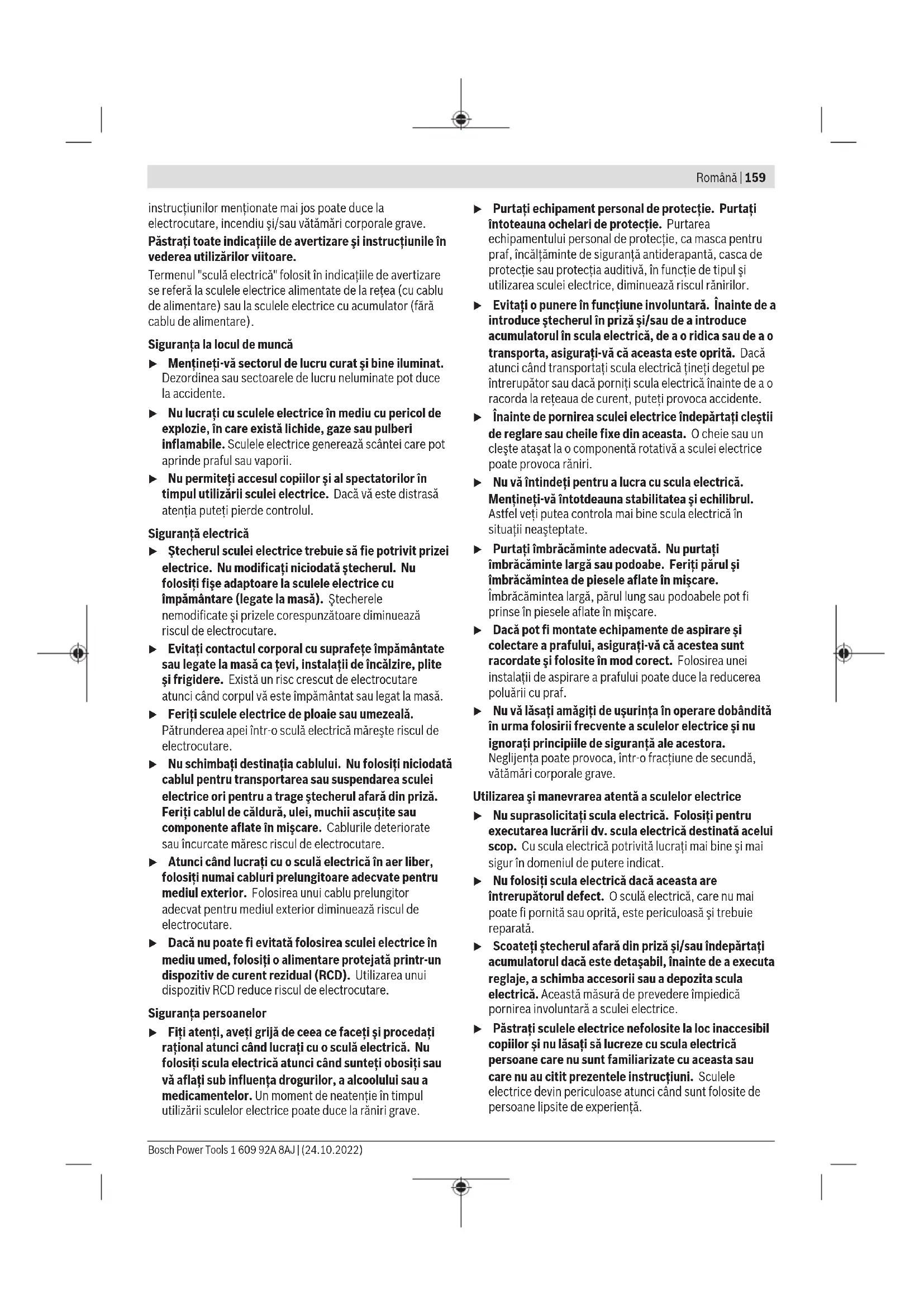 Ұсынылған литий-иондық аккумуляторлар қауіпті тауарларға қойылатын талаптарға бағынады. Пайдаланушы аккумуляторларды көшеде қосымша құжаттарсыз тасымалдай алады. Үшінші тұлғалар (мысалы, әуе көлігі немесе жіберу) орамаға және маркаларға қойылатын арнайы талаптарды сақтау керек. Жіберуге дайындау кезінде қауіпті жүктерді тасымалдау маманымен хабарласу керек. Аккумуляторды корпусы зақымдалған болса ғана жіберіңіз. Ашық түйіспелерді желімдеңіз және аккумуляторды орамада қозғалмайтындай ораңыз. Қажет болса, қосымша ұлттық ережелерді сақтаңыз. Кәдеге жарату Электр құралдарды, аккумуляторларды, керек-жарақтарды және орау материалдарын экологиялық тұрғыдан дұрыс утилизациялауға тапсыру керек. Электр құралдарды және аккумуляторларды/батареяларды үй қоқысына тастамаңыз! Тек қана ЕО елдері үшін: Ескі электрлік және электрондық құрылғылар туралы 2012/19/EU еуропалық директивасы және оның ұлттық заңнамада қолданылуы бойынша пайдалануға бұдан былай жарамсыз электрлік құралдарды және 2006/66/ ЕC еуропалық директивасы бойынша зақымдалған немесе ескірген аккумуляторларды/батареяларды бөлек жинап, қоршаған орта үшін қауіпсіз жолмен қайта өңдеуге жіберу қажет. Қате жолмен кәдеге жаратылған ескі электрлік және электрондық құрылғылар қауіпті заттардың болу мүмкіндігіне байланысты қоршаған ортаға және адам денсаулығына зиянды әсер тигізуі мүмкін. Аккумуляторлар/батареялар: Литий-иондық: Тасымалдау бөліміндегі нұсқауларды орындаңыз (қараңыз „Тасымалдау“, Бет158). Română Instrucţiuni de siguranţă Instrucţiuni generale de siguranţă pentru scule electrice AVERTIS- MENT Citiţi toate avertizările, instrucţiunile, ilustraţiile şi specificaţiile puse la dispoziţie împreună cu această sculă electrică. Nerespectarea 1 609 92A 8AJ | (24.10.2022) Bosch Power ToolsRomână | 159 instrucţiunilor menţionate mai jos poate duce la electrocutare, incendiu şi/sau vătămări corporale grave. Păstraţi toate indicaţiile de avertizare şi instrucţiunile în vederea utilizărilor viitoare. Termenul "sculă electrică" folosit în indicaţiile de avertizare se referă la sculele electrice alimentate de la reţea (cu cablu de alimentare) sau la sculele electrice cu acumulator (fără cablu de alimentare). Siguranţa la locul de muncă u Menţineţi‑vă sectorul de lucru curat şi bine iluminat. Dezordinea sau sectoarele de lucru neluminate pot duce la accidente. u Nu lucraţi cu sculele electrice în mediu cu pericol de explozie, în care există lichide, gaze sau pulberi inflamabile. Sculele electrice generează scântei care pot aprinde praful sau vaporii. u Nu permiteţi accesul copiilor şi al spectatorilor în timpul utilizării sculei electrice. Dacă vă este distrasă atenţia puteţi pierde controlul. Siguranţă electrică u Ştecherul sculei electrice trebuie să fie potrivit prizei electrice. Nu modificaţi niciodată ştecherul. Nu folosiţi fişe adaptoare la sculele electrice cu împământare (legate la masă). Ştecherele nemodificate şi prizele corespunzătoare diminuează riscul de electrocutare. u Evitaţi contactul corporal cu suprafeţe împământate sau legate la masă ca ţevi, instalaţii de încălzire, plite şi frigidere. Există un risc crescut de electrocutare atunci când corpul vă este împământat sau legat la masă. u Feriţi sculele electrice de ploaie sau umezeală. Pătrunderea apei într‑o sculă electrică măreşte riscul de electrocutare. u Nu schimbaţi destinaţia cablului. Nu folosiţi niciodată cablul pentru transportarea sau suspendarea sculei electrice ori pentru a trage ştecherul afară din priză. Feriţi cablul de căldură, ulei, muchii ascuţite sau componente aflate în mişcare. Cablurile deteriorate sau încurcate măresc riscul de electrocutare. u Atunci când lucraţi cu o sculă electrică în aer liber, folosiţi numai cabluri prelungitoare adecvate pentru mediul exterior. Folosirea unui cablu prelungitor adecvat pentru mediul exterior diminuează riscul de electrocutare. u Dacă nu poate fi evitată folosirea sculei electrice în mediu umed, folosiţi o alimentare protejată printr-un dispozitiv de curent rezidual (RCD). Utilizarea unui dispozitiv RCD reduce riscul de electrocutare. Siguranţa persoanelor u Fiţi atenţi, aveţi grijă de ceea ce faceţi şi procedaţi raţional atunci când lucraţi cu o sculă electrică. Nu folosiţi scula electrică atunci când sunteţi obosiţi sau vă aflaţi sub influenţa drogurilor, a alcoolului sau a medicamentelor. Un moment de neatenţie în timpul utilizării sculelor electrice poate duce la răniri grave. u Purtaţi echipament personal de protecţie. Purtaţi întoteauna ochelari de protecţie. Purtarea echipamentului personal de protecţie, ca masca pentru p