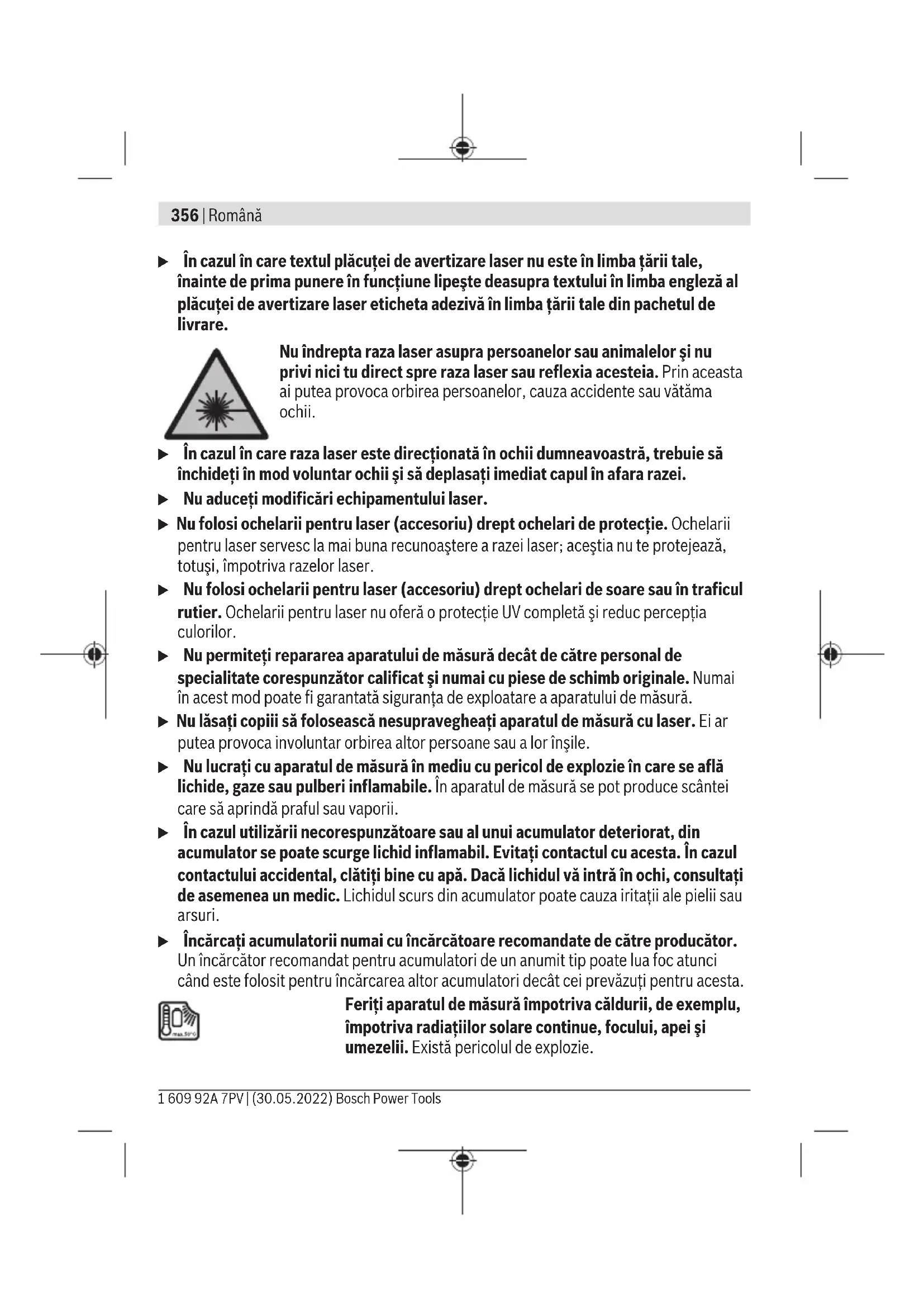 გახსნამ შესაძლოა გამოიწვიოს საზომი ხელსაწყოს განადგურება. საზომი ხელსაწყოდან აკუმულატორის ამოსაღებად, საზომი ხელსაწყო ჩართული დატოვეთ მანამდე, სანამ აკუმულატორი ბოლომდე არ განიმუხტება. ამოხრახნეთ ხრახნები კორპუსზე და მოხსენით გარსაცმი, რათა ამოიღოთ აკუმულატორი. მოკლე ჩართვის თავიდან აცილების მიზნით გამორთეთ რიგ-რიგობით ყველა კონტაქტი აკუმულატორზე და გააცალკევეთ პოლუსები. სრულად დაცლის შემდეგაც კი, აკუმულატორს აქვს ნარჩენი ტევადობა, რომელიც შეიძლება გამოთავისუფლდეს მოკლე ჩართვის შემთხვევაში. Română Instrucţiuni de siguranţă Citiţi şi respectaţi toate instrucţiunile pentru a putea nepericulos şi sigur cu aparatul de măsură. Dacă aparatul de măsură nu este folosit conform prezentelor instrucţiuni, dispozitivele de protecţie integrate în acesta pot fi afectate. Nu deterioraţi niciodată indicatoarele de avertizare de pe aparatul dumneavoastră de măsură, făcându-le nelizibile. PĂSTRAŢI ÎN CONDIŢII OPLTIME PREZENTELE INSTRUCŢIUNI ŞI TRANSMITEŢI-LE MAI DEPARTE LA PREDAREA APARATULUI DE MĂSURĂ. u Atenţie – dacă se folosesc ale echipamente de operare sau ajustare sau dacă se lucrează după alte procedee decât cele specificate în prezentele instrucţiuni, aceasta poate duce la o expunere la radiaţii periculoasă. u Aparatul de măsură este livrat împreună cu o plăcuţă de avertizare laser (prezentată în schiţa aparatului de măsură de la pagina grafică marcată). Bosch Power Tools 1 609 92A 7PV | (30.05.2022)356 | Română u În cazul în care textul plăcuţei de avertizare laser nu este în limba ţării tale, înainte de prima punere în funcţiune lipeşte deasupra textului în limba engleză al plăcuţei de avertizare laser eticheta adezivă în limba ţării tale din pachetul de livrare. Nu îndrepta raza laser asupra persoanelor sau animalelor şi nu privi nici tu direct spre raza laser sau reflexia acesteia. Prin aceasta ai putea provoca orbirea persoanelor, cauza accidente sau vătăma ochii. u În cazul în care raza laser este direcţionată în ochii dumneavoastră, trebuie să închideţi în mod voluntar ochii şi să deplasaţi imediat capul în afara razei. u Nu aduceţi modificări echipamentului laser. u Nu folosi ochelarii pentru laser (accesoriu) drept ochelari de protecţie. Ochelarii pentru laser servesc la mai buna recunoaştere a razei laser; aceştia nu te protejează, totuşi, împotriva razelor laser. u Nu folosi ochelarii pentru laser (accesoriu) drept ochelari de soare sau în traficul rutier. Ochelarii pentru laser nu oferă o protecţie UV completă şi reduc percepţia culorilor. u Nu permiteţi repararea aparatului de măsură decât de către personal de specialitate corespunzător calificat şi numai cu piese de schimb originale. Numai în acest mod poate fi garantată siguranţa de exploatare a aparatului de măsură. u Nu lăsaţi copiii să folosească nesupravegheaţi aparatul de măsură cu laser. Ei ar putea provoca involuntar orbirea altor persoane sau a lor înşile. u Nu lucraţi cu aparatul de măsură în mediu cu pericol de explozie în care se află lichide, gaze sau pulberi inflamabile. În aparatul de măsură se pot produce scântei care să aprindă praful sau vaporii. u În cazul utilizării necorespunzătoare sau al unui acumulator deteriorat, din acumulator se poate scurge lichid inflamabil. Evitaţi contactul cu acesta. În cazul contactului accidental, clătiţi bine cu apă. Dacă lichidul vă intră în ochi, consultaţi de asemenea un medic. Lichidul scurs din acumulator poate cauza iritaţii ale pielii sau arsuri. u Încărcaţi acumulatorii numai cu încărcătoare recomandate de către producător. Un încărcător recomandat pentru acumulatori de un anumit tip poate lua foc atunci când este folosit pentru încărcarea altor acumulatori decât cei prevăzuţi pentru acesta. Feriţi aparatul de măsură împotriva căldurii, de exemplu, împotriva radiaţiilor solare continue, focului, apei şi umezelii. Există pericolul de explozie. 1 609 92A 7PV | (30.05.2022) Bosch Power ToolsRomână | 357 u Aparatul de măsură este prevăzut cu o interfaţă radio. Trebuie luate în calcul limitările locale în funcţionare, de exemplu, în avioane sau spitale. Marca verbală Bluetooth®, precum şi siglele sunt mărci înregistrate şi proprietatea Bluetooth SIG, Inc. Orice utilizare a acestei mărci verbale/acestor sigle de către Robert Bosch Power Tools GmbH se realizează sub licenţă. u Atenţie! În cazul utilizării aparatului de măsură cu Bluetooth® se pot produce deranjamente ale altor echipamente şi instalaţii, avioane şi aparate medicale (de exemplu, stimulatoare cardiace, aparate auditive). De asemenea, nu poate fi complet exclusă afectarea oamenilor şi animalelor din imediata vecinătate. Nu utilizaţi aparatul de măsură cu Bluetooth® în apropierea aparatelor medicale, staţiilor de benzină, instalaţiilor chimice, sectoarelor cu pericol de explozie şi în zonele de detonare. Nu utilizaţi aparatul de măsură cu Bluetooth® în avioane. Evitaţi folosirea mai îndelungată în imediata apropiere a corpului. u Nu folosiţi