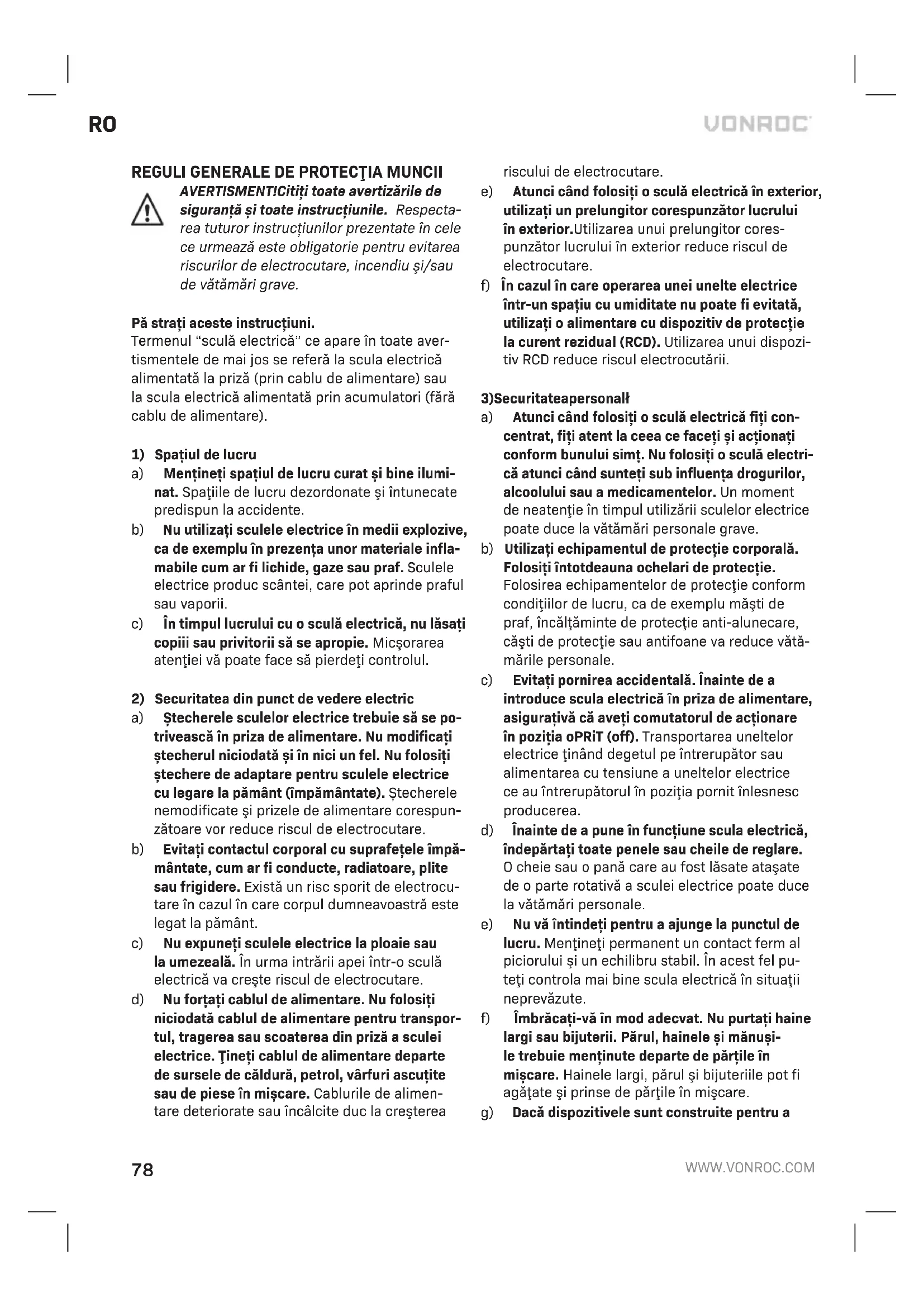 Numai pentru ţările din CE Nu aruncaţi echipamentele acţionate electric îm- preună cu gunoiul menajer. Conform Indicaţiei eu- ropene 2012/19/EU pentru echipamente electrice şi electronice uzate şi a implementării sale la nivel naţional, echipamentele acţionate electric scoase din uz trebuie colectate separat şi evacuate într-o manieră ecologică. GARANŢIE Produsele VONROC sunt realizate la cele mai înalte standarde de calitate şi sunt garantate în privinţa materialelor şi a manoperei pentru întreaga perioadă de utilizare în garanţie, începând cu data achiziţiei. În cazul în care produsul se defectează în timpul perioadei de utilizare, contactaţi direct VONROC. Următoarele circumstanţe sunt excluse de la această garanţie: