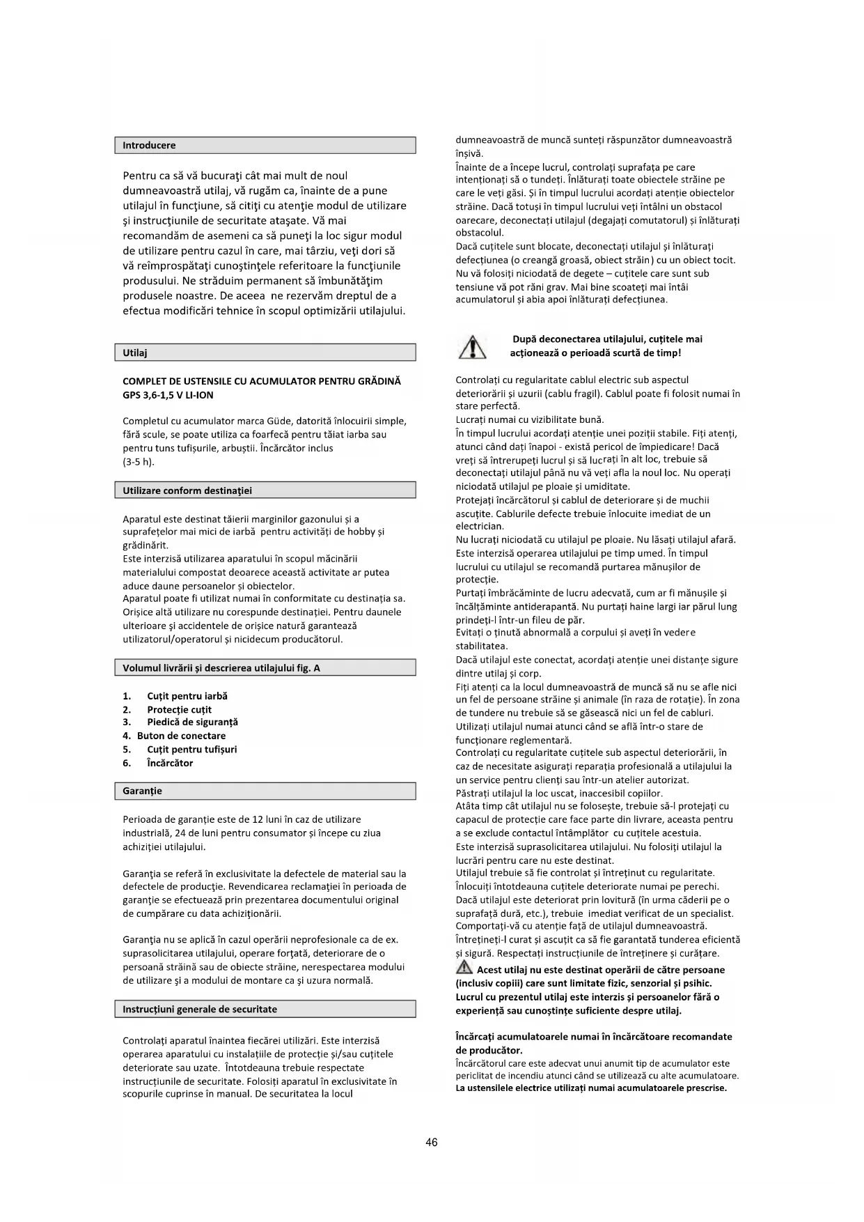 Completul cu acumulator marca Güde, datorită înlocuirii simple, fără scule, se poate utiliza ca foarfecă pentru tăiat iarba sau pentru tuns tufișurile, arbuștii. Încărcător inclus (3-5 h). Utilizare conform destinaţiei Aparatul este destinat tăierii marginilor gazonului și a suprafețelor mai mici de iarbă pentru activități de hobby și grădinărit. Este interzisă utilizarea aparatului în scopul măcinării materialului compostat deoarece această activitate ar putea aduce daune persoanelor și obiectelor. Aparatul poate fi utilizat numai în conformitate cu destinația sa. Orișice altă utilizare nu corespunde destinației. Pentru daunele ulterioare şi accidentele de orișice natură garantează utilizatorul/operatorul și nicidecum producătorul. Volumul livrării și descrierea utilajului fig. A