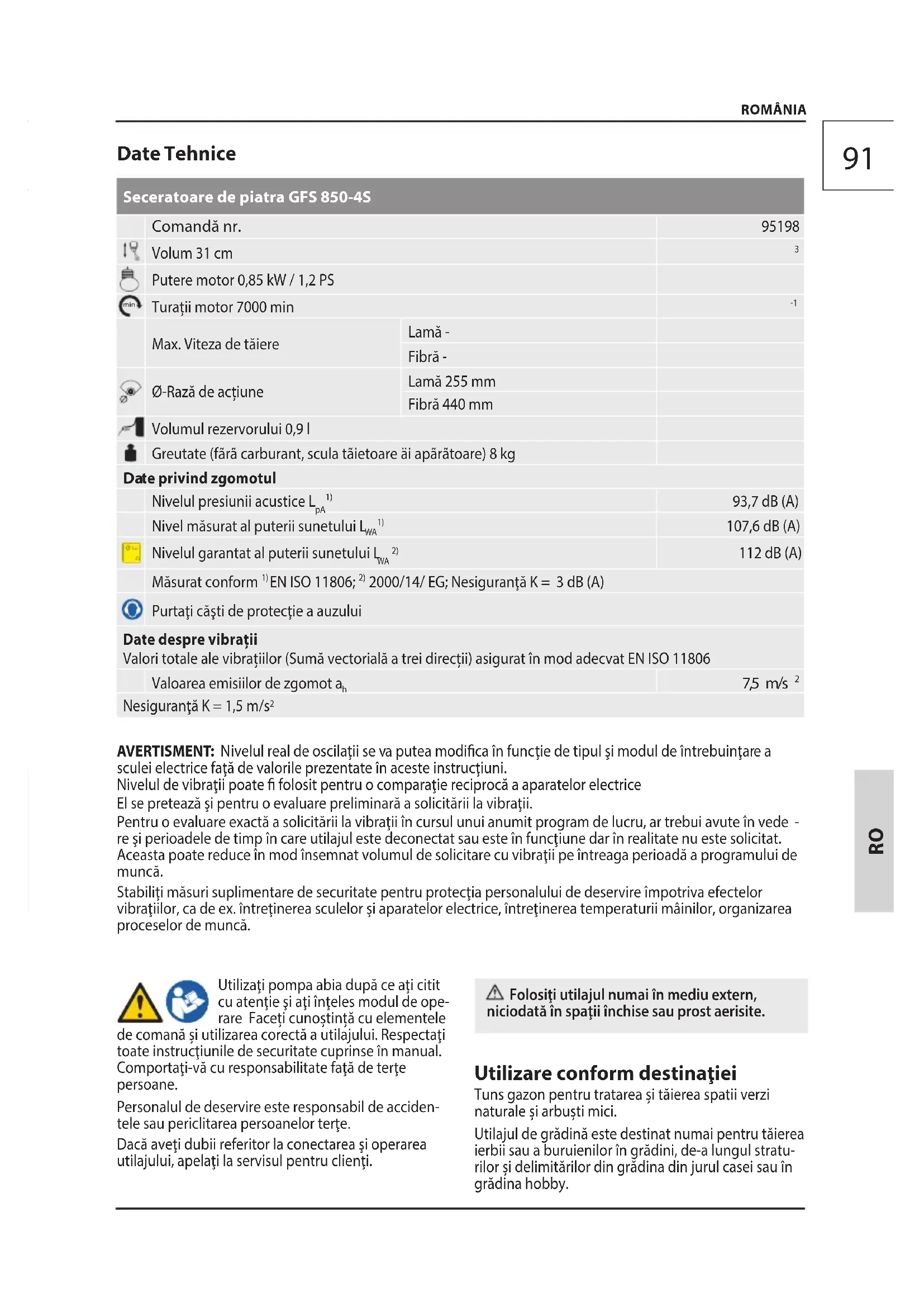 tele sau periclitarea persoanelor terţe. Dacă aveţi dubii referitor la conectarea şi operarea utilajului, apelaţi la servisul pentru clienţi. Folosiţi utilajul numai în mediu extern, niciodată în spaţii închise sau prost aerisite. Utilizare conform destinaţiei Tuns gazon pentru tratarea și tăierea spatii verzi naturale și arbuști mici. Utilajul de grădină este destinat numai pentru tăierea ierbii sau a buruienilor în grădini, de-a lungul stratu