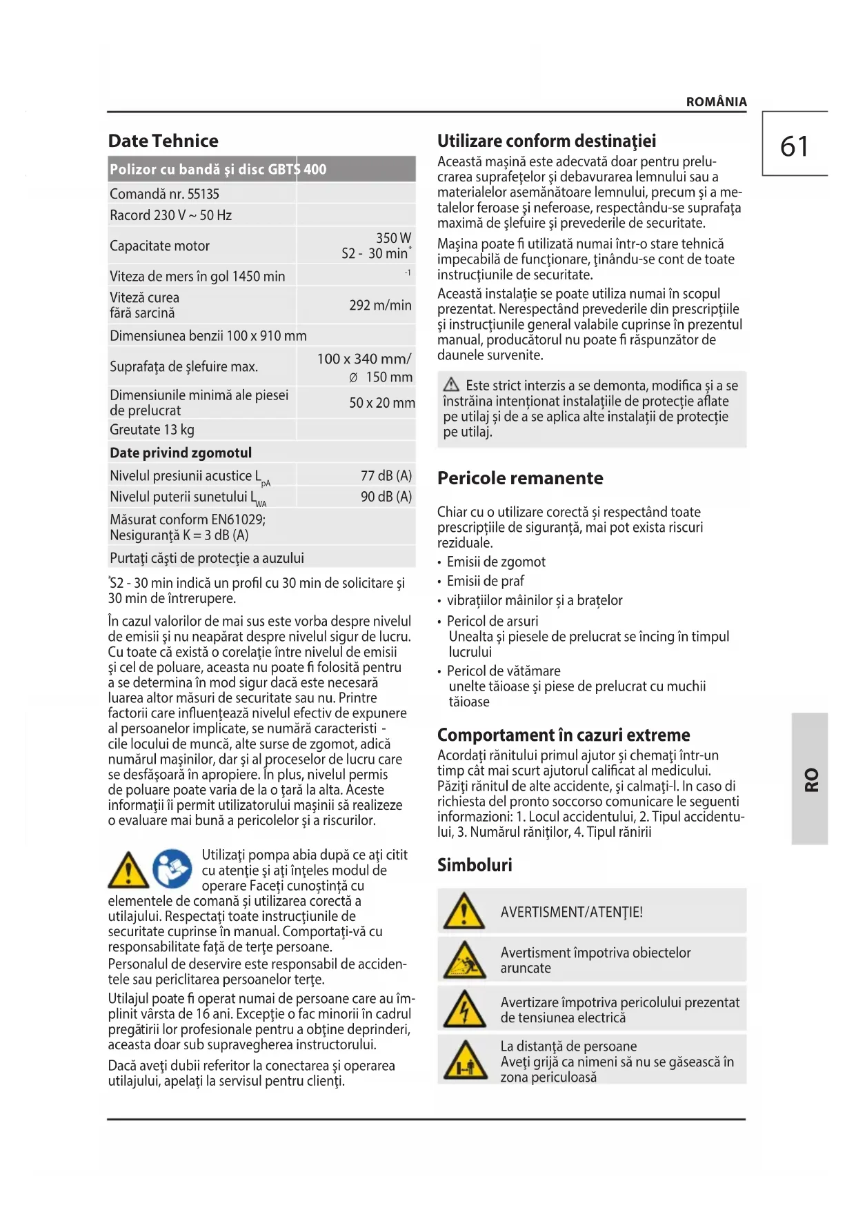 mărul maşinilor, dar şi al proceselor de lucru care se desfăşoară în apropiere. În plus, nivelul permis de poluare poate varia de la o ţară la alta. Aceste informaţii îi permit utilizatorului maşinii să realizeze o evaluare mai bună a pericolelor şi a riscurilor. Utilizaţi pompa abia după ce aţi citit cu atenţie şi aţi înţeles modul de operare Faceți cunoștință cu elementele de comană și utilizarea corectă a utilajului. Respectaţi toate instrucţiunile de securitate cuprinse în manual. Comportaţi-vă cu responsabilitate faţă de terţe persoane. Personalul de deservire este responsabil de acciden- tele sau periclitarea persoanelor terţe. Utilajul poa te operat numai de persoane care au îm- plinit vârsta de 16 ani. Excepţie o fac minorii în cadrul pregă tirii lor profesionale pentru a obţine deprinderi, aceasta doar sub supravegherea instructorului. Dacă aveţi dubii referitor la conectarea şi operarea utilajului, apelaţi la servisul pentru clienţi. Utilizare conform destinaţiei Această maşină este adecvată doar pentru prelu- crarea suprafeţelor şi debavurarea lemnului sau a materialelor asemănătoare lemnului, precum şi a me- talelor feroase şi neferoase, respectându-se suprafaţa maximă de şlefuire şi prevederile de securitate. Maşina poate utilizată numai într-o stare tehnică impecabilă de funcţionare, ţinându-se cont de toate instrucţiunile de securitate. Această instalaţie se poate utiliza numai în scopul prezentat. Nerespectând prevederile din prescripţiile şi instrucţiunile general valabile cuprinse în prezentul manual, producătorul nu poate răspunzător de daunele survenite. Este strict interzis a se demonta, modica și a se înstrăina intenționat instalațiile de protecție aate pe utilaj și de a se aplica alte instalații de protecție pe utilaj. Pericole remanente Chiar cu o utilizare corectă și respectând toate prescripțiile de siguranță, mai pot exista riscuri reziduale.
