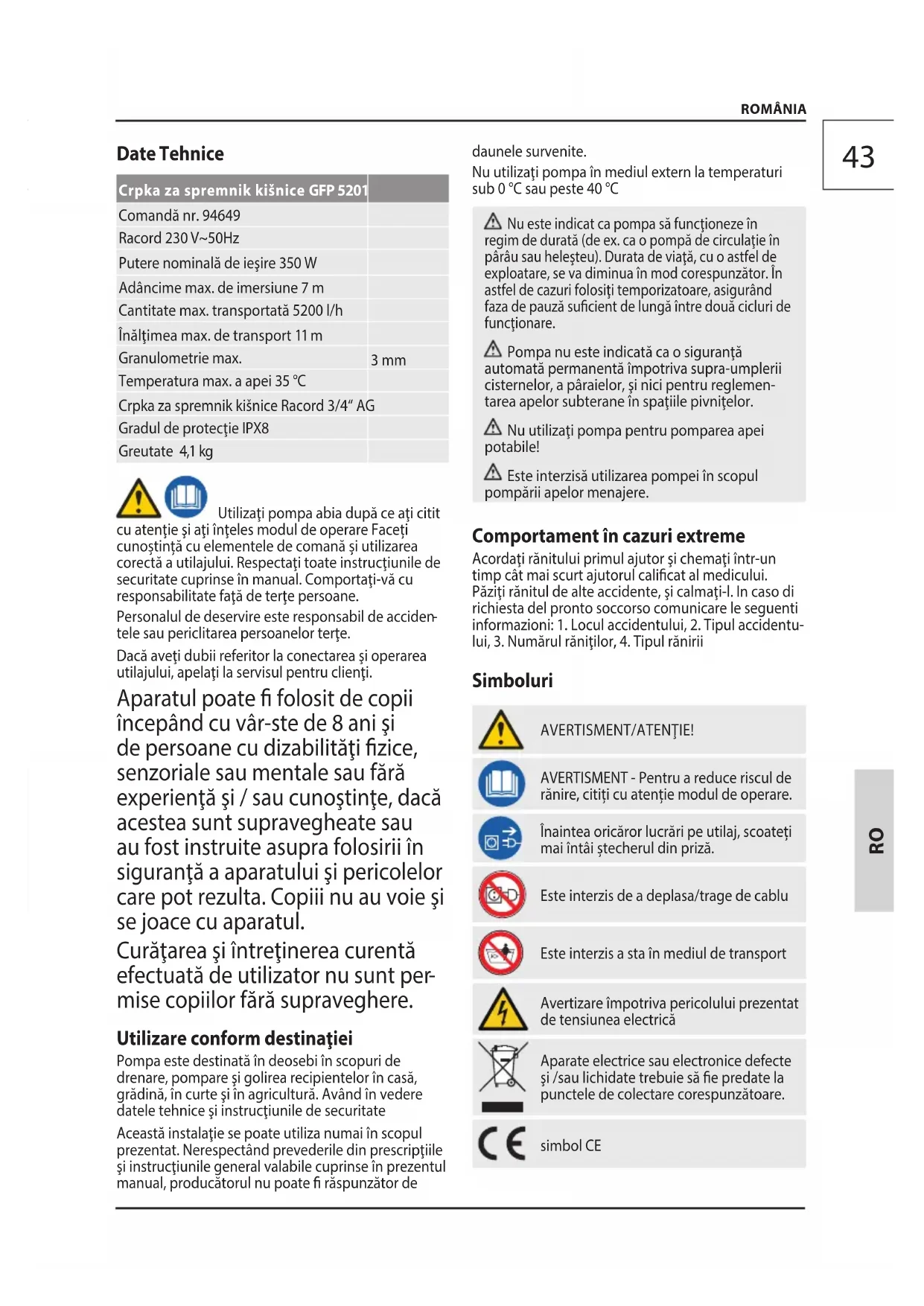 ROMÂNIA Date Tehnice Crpka za spremnik kišnice GFP 5201 Comandă nr. 94649 Racord 230 V~50Hz Putere nominală de ieşire 350 W Adâncime max. de imersiune 7 m Cantitate max. transportată 5200 l/h Înălţimea max. de transport 11 m Granulometrie max. 3 mm Temperatura max. a apei 35 °C Crpka za spremnik kišnice Racord 3/4“ AG Gradul de protecţie IPX8 Greutate 4,1 kg Utilizaţi pompa abia după ce aţi citit cu atenţie şi aţi înţeles modul de operare Faceți cunoștință cu elementele de comană și utilizarea corectă a utilajului. Respectaţi toate instrucţiunile de securitate cuprinse în manual. Comportaţi-vă cu responsabilitate faţă de terţe persoane. Personalul de deservire este responsabil de acciden