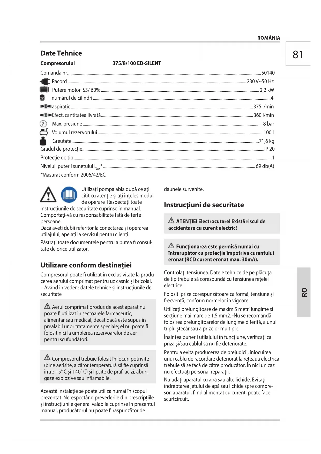 sor: aparatul, ind alimentat cu curent, poate face scurtcircuit. Date Tehnice Compresorului 375/8/100 ED-SILENT82 Folosirea compresorului în scopurile pentru care a fost proiectat (umare, anumite operaţii care necesită racordarea ustensilelor pneumatice, vopsire, spălare cu detergenţi apoşi, etc.) impune cunoaşterea şi respectarea normelor prevăzute, specice ecărui caz. Acest compresor funcţionează cu un raport de intermitenţă (indicat pe plăcuţa cu datele tehnice) de 25% (2.5 minute de funcţionare şi 7.5 minute de pauză) pentru a evita încălzirea excesivă a motorului electric. Dacă se verică o astfel de situaţie, mecanis
