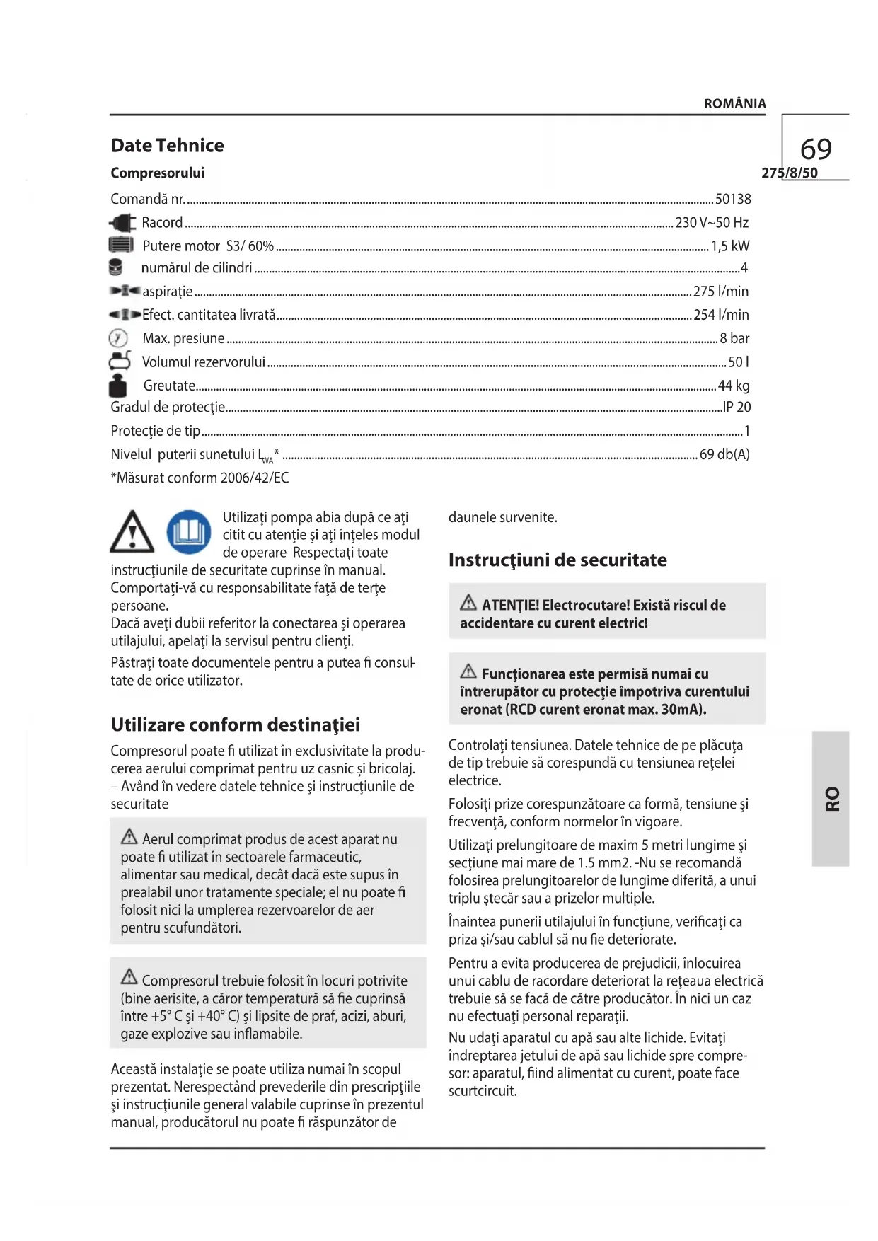 tate de orice utilizator. Utilizare conform destinaţiei Compresorul poate utilizat în exclusivitate la produ- cerea aerului comprimat pentru uz casnic și bricolaj. – Având în vedere datele tehnice şi instrucţiunile de securitate Aerul comprimat produs de acest aparat nu poate utilizat în sectoarele farmaceutic, alimentar sau medical, decât dacă este supus în prealabil unor tratamente speciale; el nu poate folosit nici la umplerea rezervoarelor de aer pentru scufundători. Compresorul trebuie folosit în locuri potrivite (bine aerisite, a căror temperatură să e cuprinsă între +5° C şi +40° C) şi lipsite de praf, acizi, aburi, gaze explozive sau inamabile. Această instalaţie se poate utiliza numai în scopul prezentat. Nerespectând prevederile din prescripţiile şi instrucţiunile general valabile cuprinse în prezentul manual, producătorul nu poate răspunzător de daunele survenite. Instrucţiuni de securitate ATENŢIE! Electrocutare! Există riscul de accidentare cu curent electric! Funcţionarea este permisă numai cu întrerupător cu protecţie împotriva curentului eronat (RCD curent eronat max. 30mA). Controlaţi tensiunea. Datele tehnice de pe plăcuţa de tip trebuie să corespundă cu tensiunea reţelei electrice. Folosiţi prize corespunzătoare ca formă, tensiune şi frecvenţă, conform normelor în vigoare. Utilizaţi prelungitoare de maxim 5 metri lungime şi secţiune mai mare de 1.5 mm2. -Nu se recomandă folosirea prelungitoarelor de lungime diferită, a unui triplu ştecăr sau a prizelor multiple. Înaintea punerii utilajului în funcţiune, vericaţi ca priza şi/sau cablul să nu e deteriorate. Pentru a evita producerea de prejudicii, înlocuirea unui cablu de racordare deteriorat la reţeaua electrică trebuie să se facă de către producător. În nici un caz nu efectuaţi personal reparaţii. Nu udaţi aparatul cu apă sau alte lichide. Evitaţi îndreptarea jetului de apă sau lichide spre compre