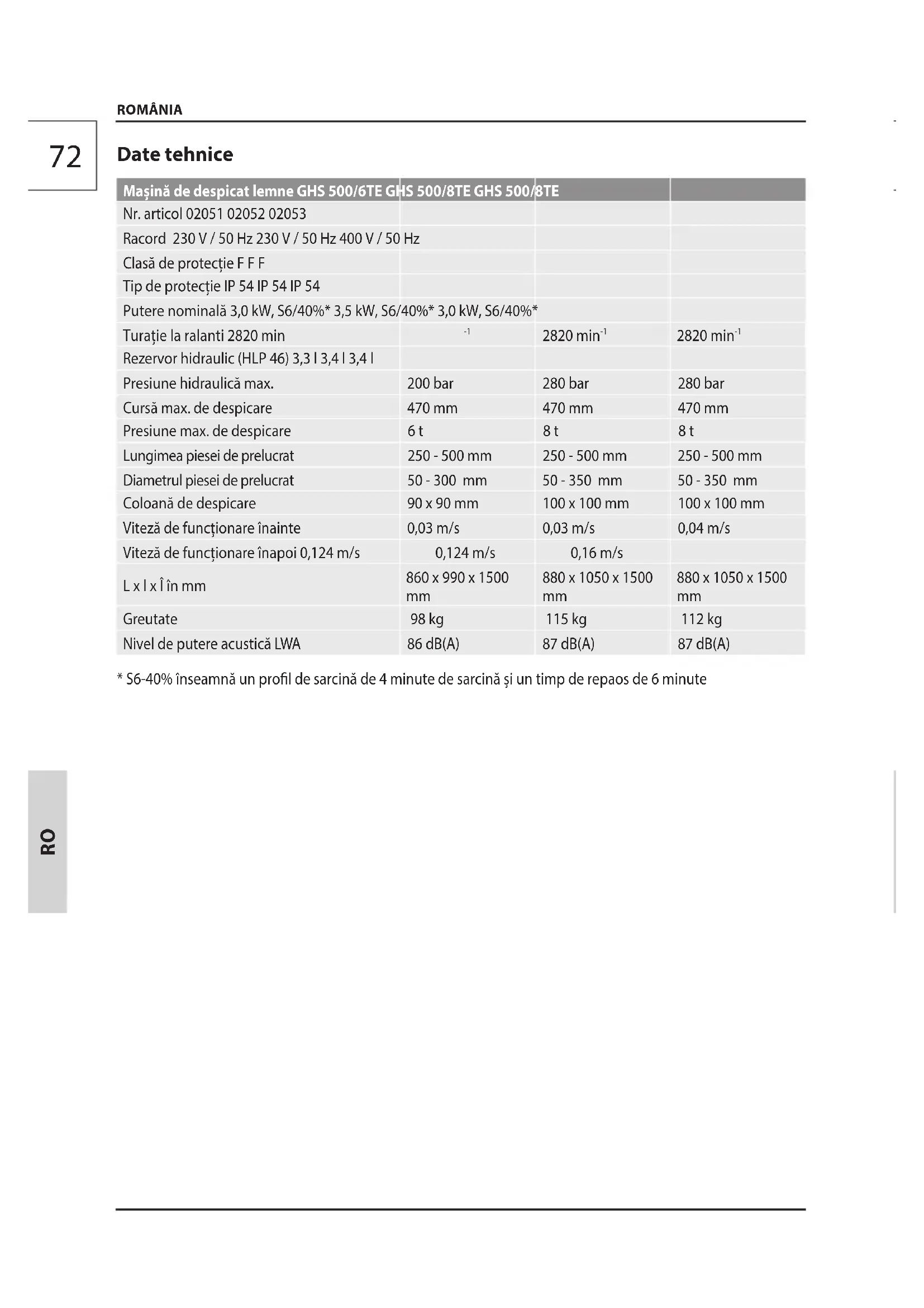 ROMÂNIA Date tehnice Mașină de despicat lemne GHS 500/6TE GHS 500/8TE GHS 500/8TE Nr. articol 02051 02052 02053 Racord 230 V / 50 Hz 230 V / 50 Hz 400 V / 50 Hz Clasă de protecție F F F Tip de protecție IP 54 IP 54 IP 54 Putere nominală 3,0 kW, S6/40%* 3,5 kW, S6/40%* 3,0 kW, S6/40%* Turație la ralanti 2820 min