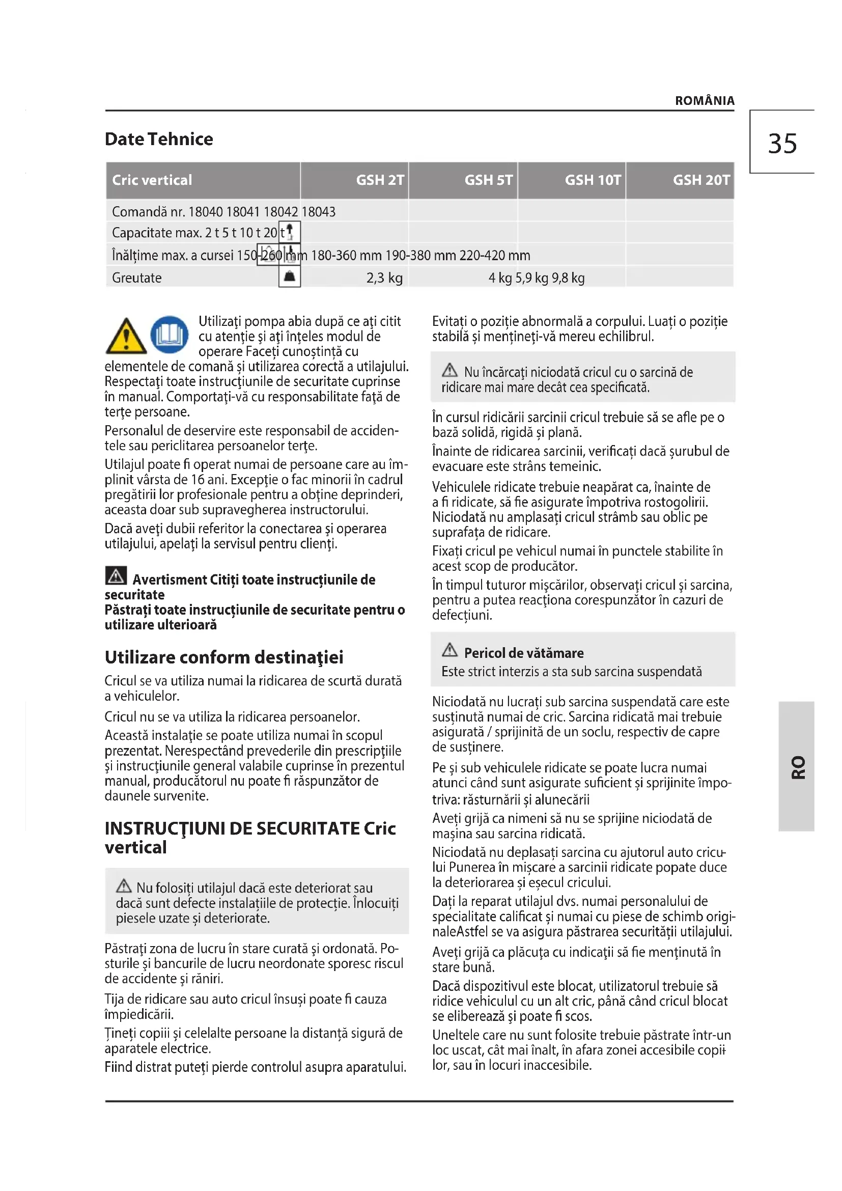 ROMÂNIA Date Tehnice Cric vertical GSH 2T GSH 5T GSH 10T GSH 20T Comandă nr. 18040 18041 18042 18043 Capacitate max. 2 t 5 t 10 t 20 t Înălțime max. a cursei 150-260 mm 180-360 mm 190-380 mm 220-420 mm Greutate 2,3 kg 4 kg 5,9 kg 9,8 kg Utilizaţi pompa abia după ce aţi citit cu atenţie şi aţi înţeles modul de operare Faceți cunoștință cu elementele de comană și utilizarea corectă a utilajului. Respectaţi toate instrucţiunile de securitate cuprinse în manual. Comportaţi-vă cu responsabilitate faţă de terţe persoane. Personalul de deservire este responsabil de acciden