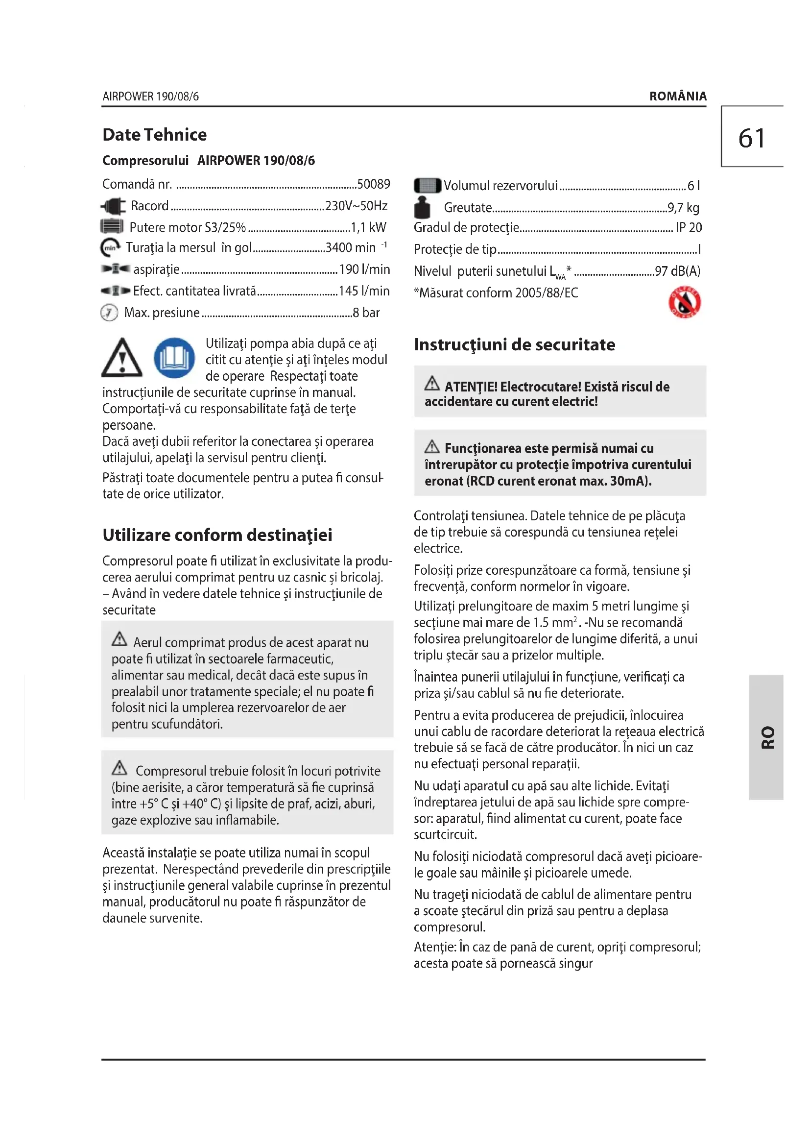 - tate de orice utilizator. Utilizare conform destinaţiei Compresorul poate utilizat în exclusivitate la produ- cerea aerului comprimat pentru uz casnic și bricolaj. – Având în vedere datele tehnice şi instrucţiunile de securitate Aerul comprimat produs de acest aparat nu poate utilizat în sectoarele farmaceutic, alimentar sau medical, decât dacă este supus în prealabil unor tratamente speciale; el nu poate folosit nici la umplerea rezervoarelor de aer pentru scufundători. Compresorul trebuie folosit în locuri potrivite (bine aerisite, a căror temperatură să e cuprinsă între +5° C şi +40° C) şi lipsite de praf, acizi, aburi, gaze explozive sau inamabile. Această instalaţie se poate utiliza numai în scopul prezentat. Nerespectând prevederile din prescripţiile şi instrucţiunile general valabile cuprinse în prezentul manual, producătorul nu poate răspunzător de daunele survenite. ROMÂNIA Date Tehnice Compresorului AIRPOWER 190/08/6 Comandă nr p. 5008