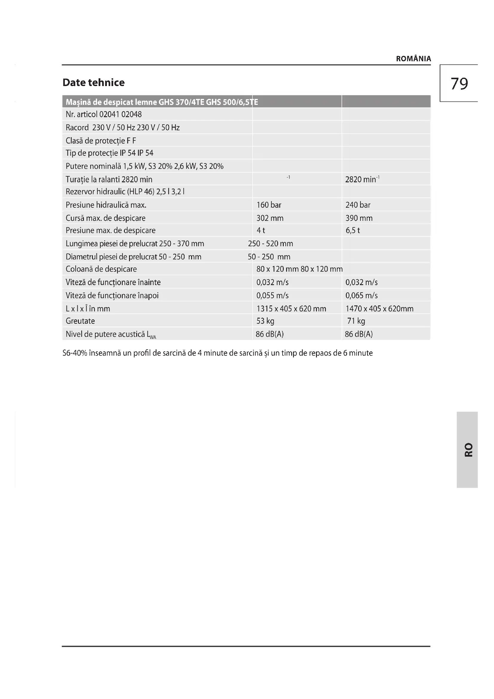 ROMÂNIA Date tehnice Mașină de despicat lemne GHS 370/4TE GHS 500/6,5TE Nr. articol 02041 02048 Racord 230 V / 50 Hz 230 V / 50 Hz Clasă de protecție F F Tip de protecție IP 54 IP 54 Putere nominală 1,5 kW, S3 20% 2,6 kW, S3 20% Turație la ralanti 2820 min