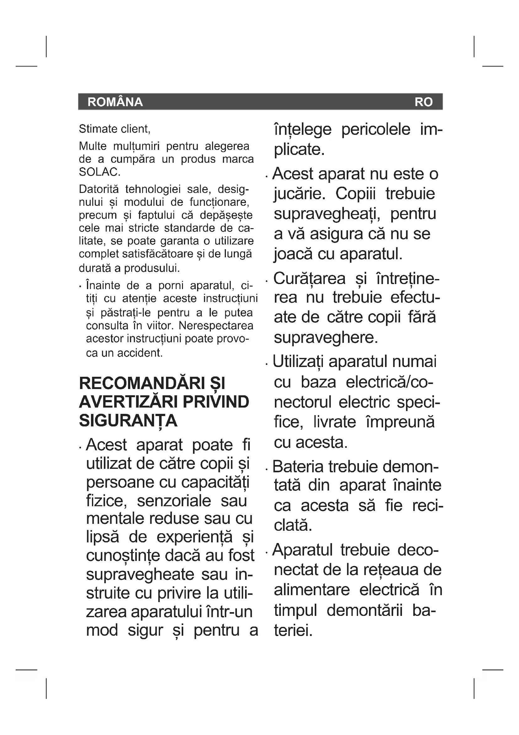Stimate client, Multe mulțumiri pentru alegerea de a cumpăra un produs marca SOLAC. Datorită tehnologiei sale, desig- nului și modului de funcționare, precum și faptului că depășește cele mai stricte standarde de ca- litate, se poate garanta o utilizare complet satisfăcătoare și de lungă durată a produsului.