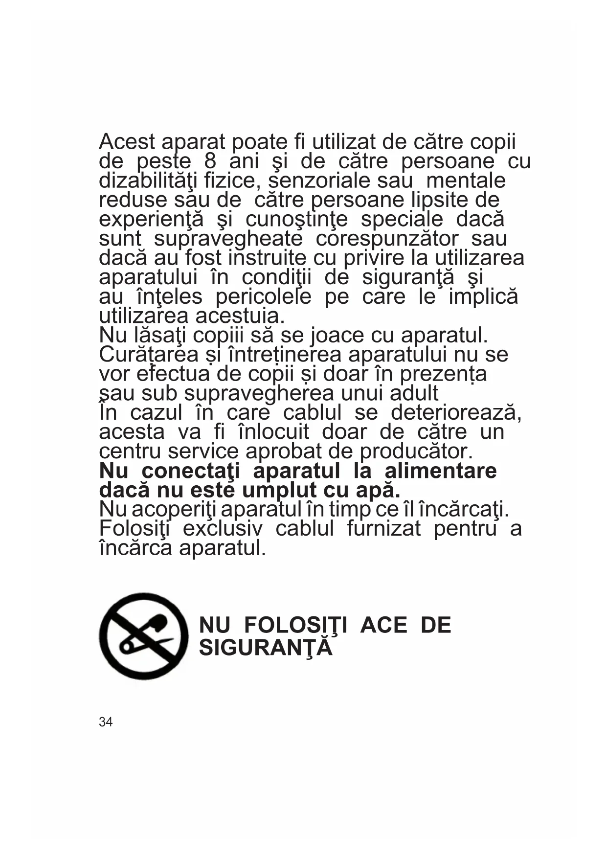 Acest aparat poate utilizat de către copii de peste 8 ani şi de către persoane cu dizabilităţi zice, senzoriale sau mentale reduse sau de către persoane lipsite de experienţă şi cunoştinţe speciale dacă sunt supravegheate corespunzător sau dacă au fost instruite cu privire la utilizarea aparatului în condiţii de siguranţă şi au înţeles pericolele pe care le implică utilizarea acestuia. Nu lăsaţi copiii să se joace cu aparatul. Curăṭarea ṣi întreṭinerea aparatului nu se vor efectua de copii ṣi doar în prezenṭa sau sub supravegherea unui adult În cazul în care cablul se deteriorează, acesta va înlocuit doar de către un centru service aprobat de producător. Nu conectaţi aparatul la alimentare dacă nu este umplut cu apă. Nu acoperiţi aparatul în timp ce îl încărcaţi. Folosiţi exclusiv cablul furnizat pentru a încărca aparatul.35