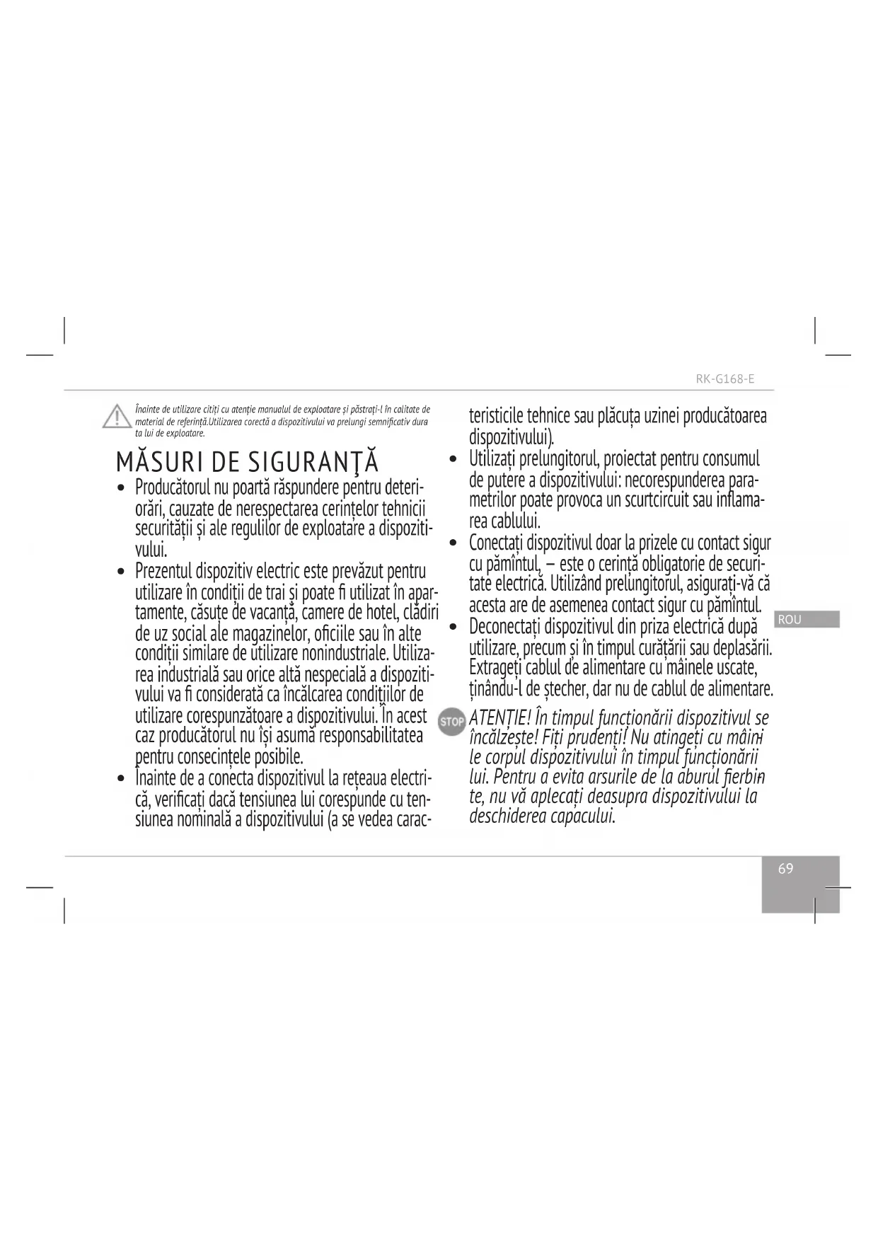 luţie şi ale depunerilor de calcar. ATENŢIE! Înainte de utilizarea repetată a erbătorului, asiguraţi-vă că contactele electrice sunt complet uscate!.RK-G168-E